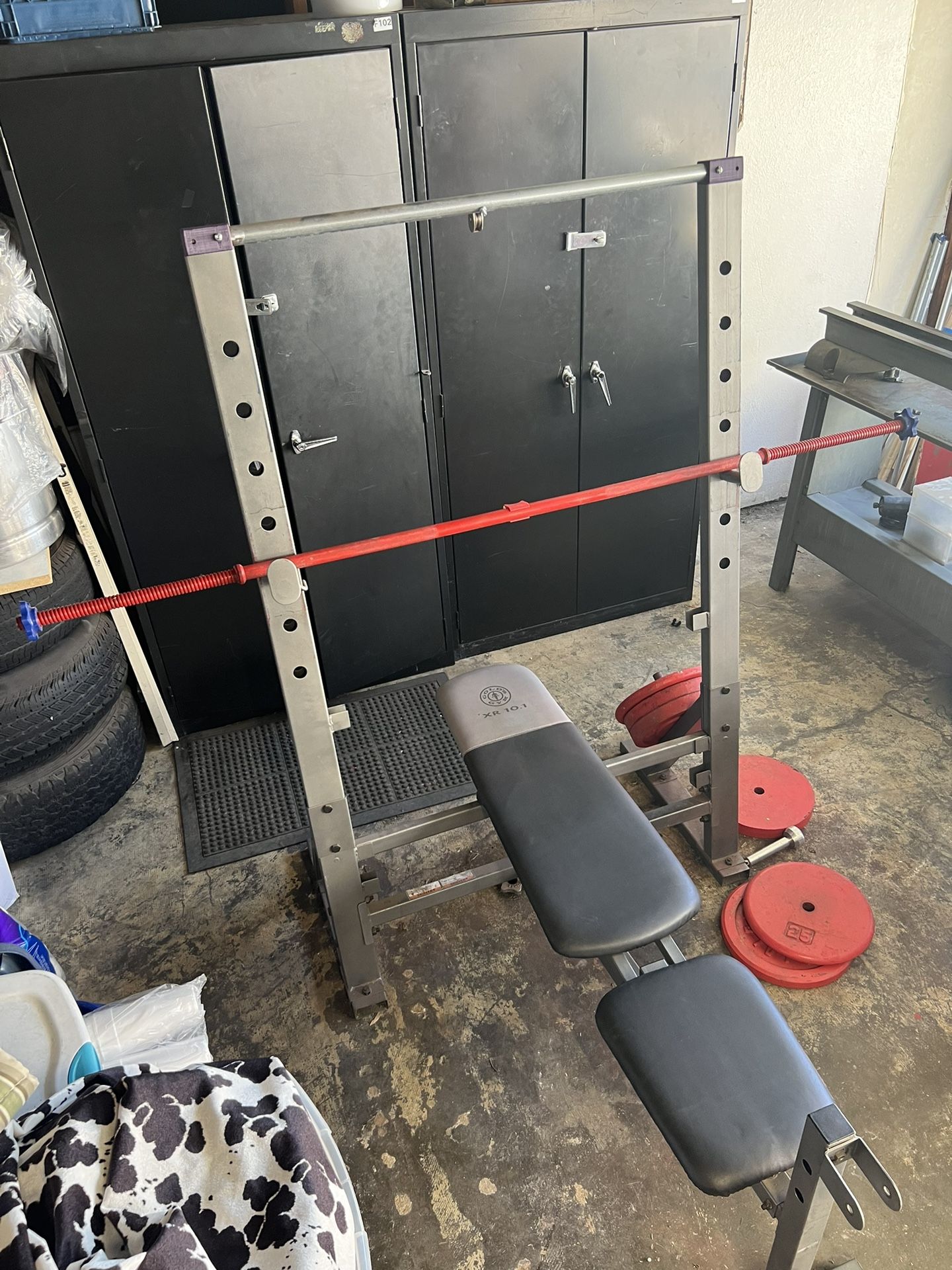 5 - 25lb plates 1 - Bar with the treaded end nuts 1- Adjustable Bench Moving out, throw me an offer on all of it. Ready to be sold asap.