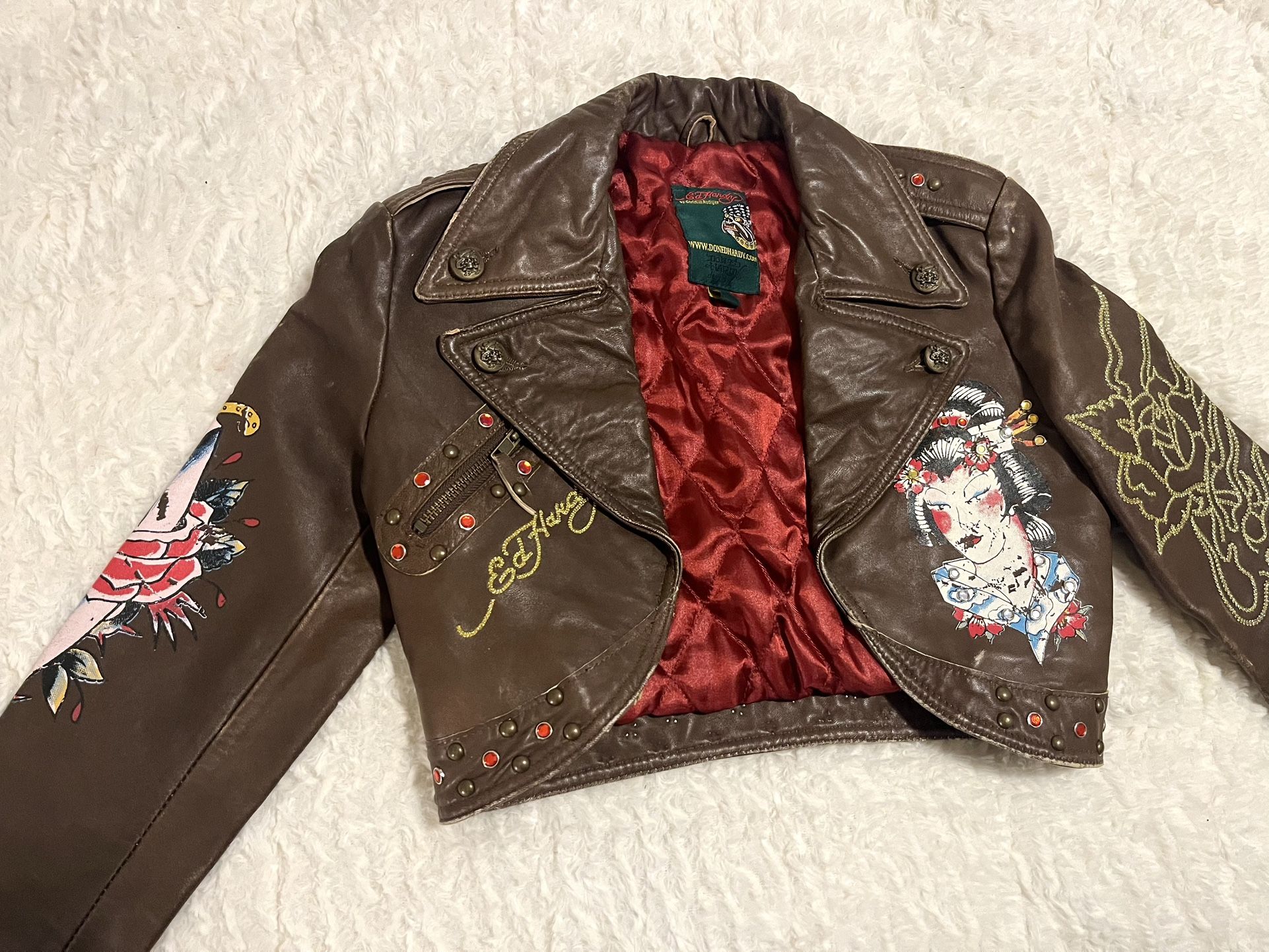 Very rare vintage LIMITED EDITION piece**** brown, genuine leather, cropped Don Ed Hardy biker jacket. Lined with a soft red satin on the inside. Gold Embroidered tattoo designs and red rhinestone studs. Size xs🫶🏻very tiny tear but it’s meant to look distressed, otherwise it’s in perfect shape. I know this is priced high, it’s pretty old and was limited edition. Only a couple were made, On top of that, I can only find people selling it for $300-$650 so I’m trying to make this worth it while still giving a good price. I really love this coat and don’t want to get rid of it, but it doesn’t fit me anymore :,,) take care of herrr