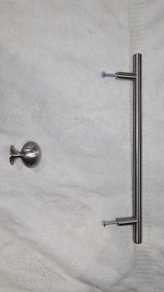 20 chrome cabinet door handles, 10 inches long, (7.5 inches hole to hole). And 12 chrome drawer knobs. Both in good condition. Just need a quick wipe and you got a near new hardware for your kitchen cabinets or closet doors. $30. Comes with all screws.