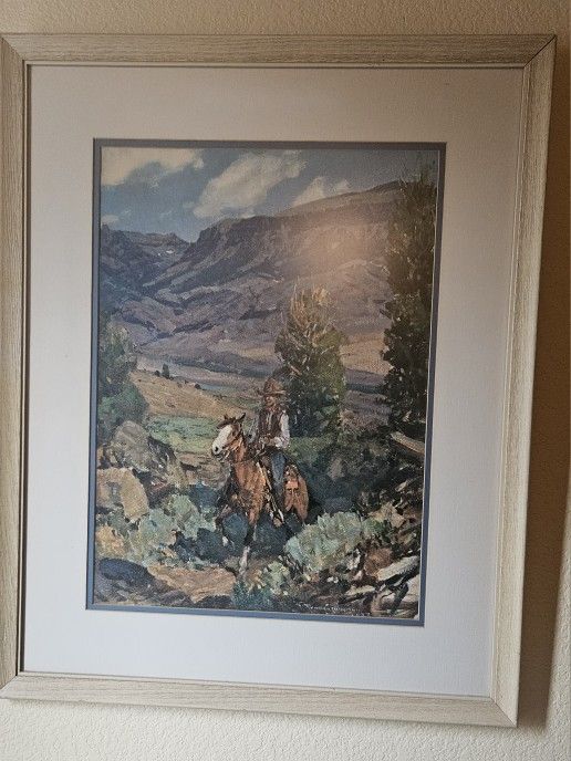 Classic two framed art prints. One has a cowboy on horse with mountains in background. Other has Native American figures on horses. Both prints are in light wood-look frames with light color matting. Good for home decor. First come first serve