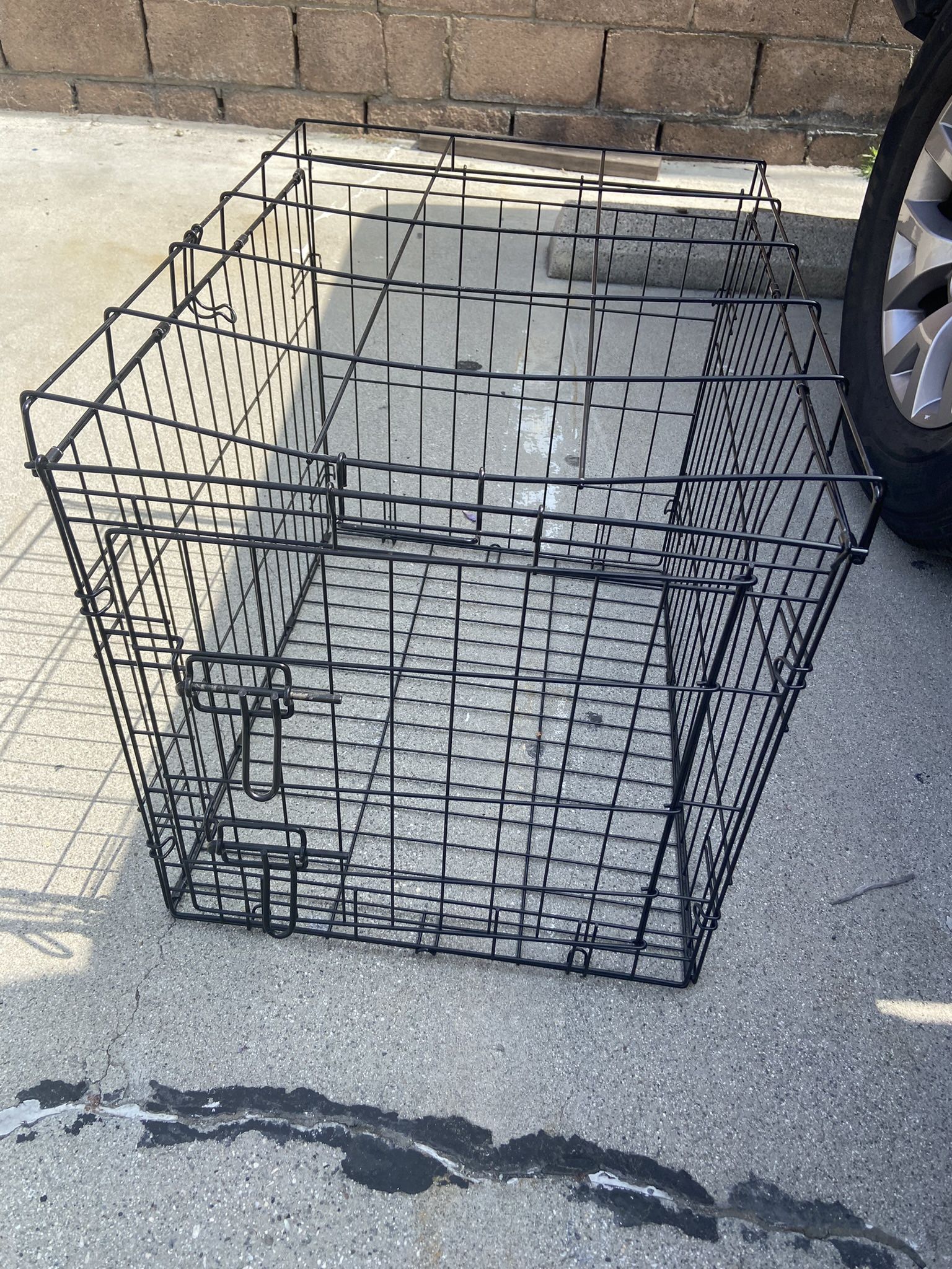 Metal pet crate - medium sized. Has a slight dent on top but still completely closes and works just fine. Dimensions: L 24” x W 18” x H 20”