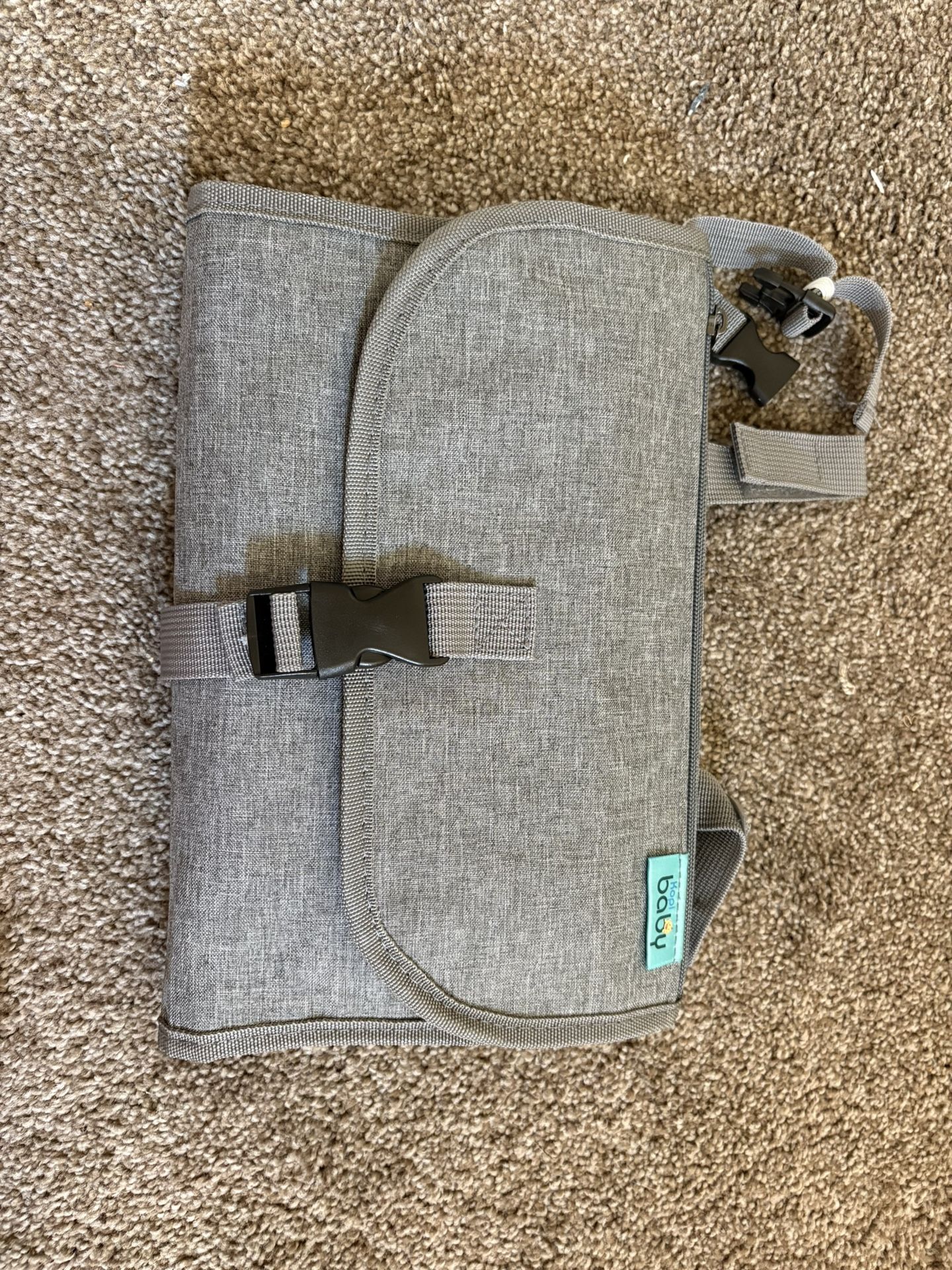 Portable changing mat for on the road or going out in public perfect for holding diapers wipes and diaper creams etc. can be clipped on the back of a chair in your car. In amazing condition.
