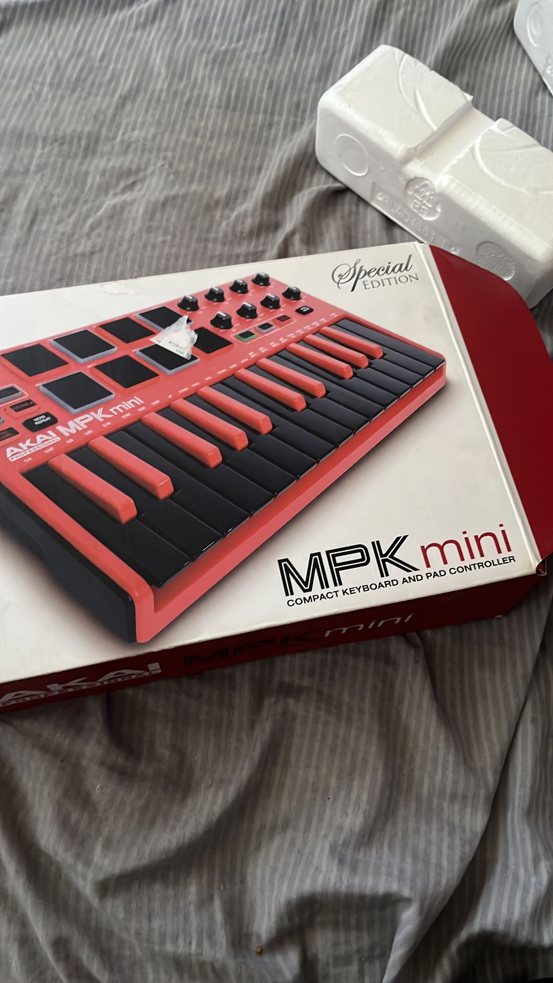 Akai Professional MPK Mini (Special Edition Red) compact MIDI keyboard and pad controller. • 25 mini keys • 8 MPC drum pads • 8 control knobs • USB powered (plug and play) • Includes original box Condition is used but works perfectly. Great for beginners or producers who need a portable setup for FL Studio, Ableton, Logic, etc. No damage to keys or pads. Ready to connect and make beats.