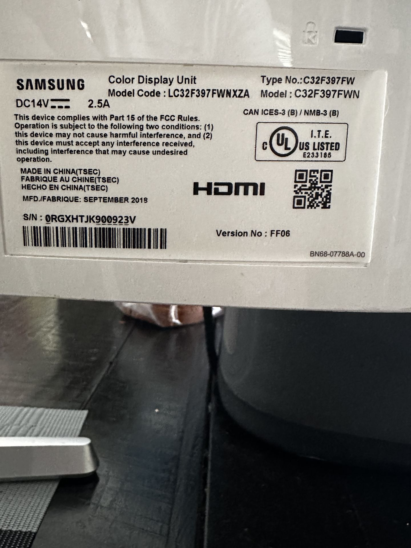 Samsung 32 inch curved LED gaming monitor 1920x1080 60hz 4 ms response time. Slight crack in plastic frame pictured.