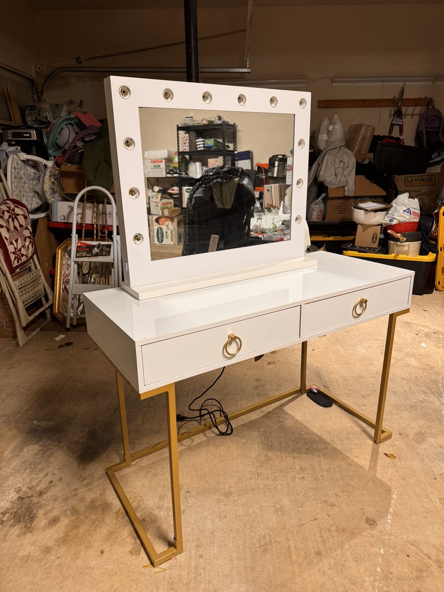 White and gold vanity desk and mirror! Send your best offer around asking price π Pick up only! -does not come with bulbs, you can get them on amazon for cheap