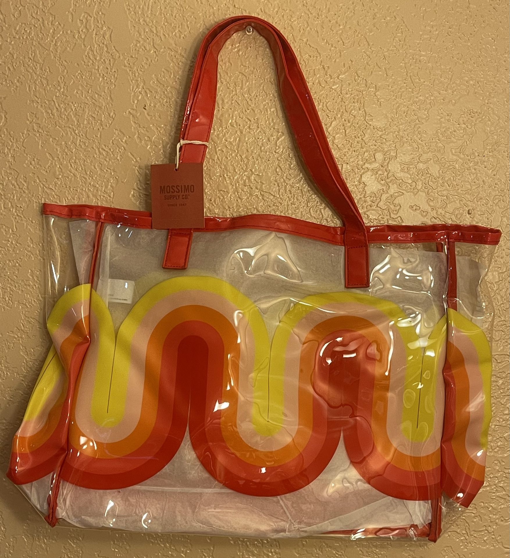 Brand new. Has a red, yellow, pink,orange waves design and red trim. The bag is see through. Sold at Target for $14.99. The bag is about 14 inches tall and about 16 inches wide. From a smoke free home Pick up only in Hemet No shipping, deliveries, or trades