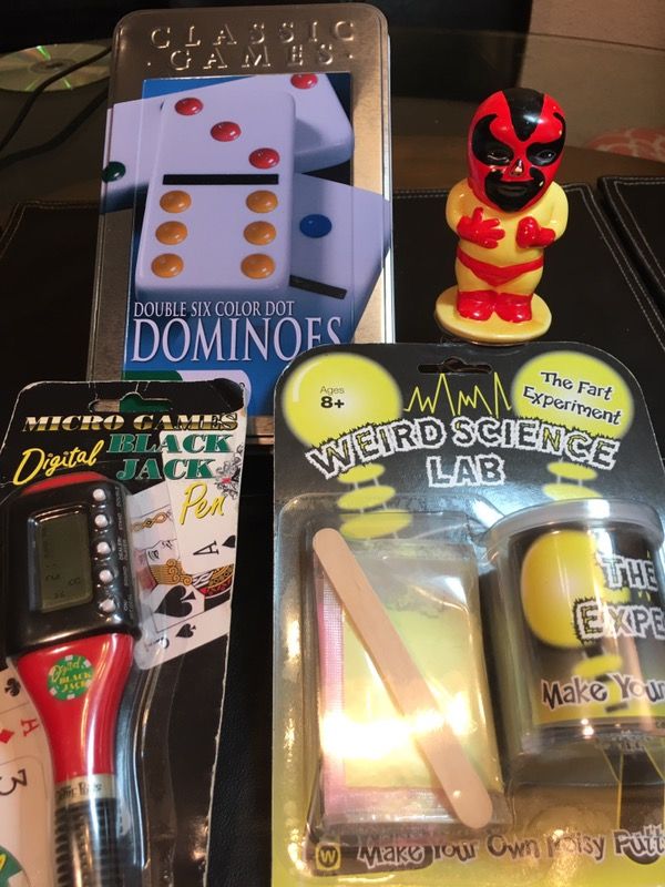 Take a break and have some fun w these little doodads. Included are a digital Black Jack pen from micro games. A bouncy luchador on spring. Tape still covered like new so when you decide the best spot for him, you can stick for more secured base if you like. Also, yes you read it right. The weird science lab "fart experiment" make your own noisy putty. Rounding this set out is the classic game Dominoes. This set came w 1 domino marked that we could not get off. Just mark a few otherst & nobody will know which is which. Hours of fun to be had w this pack.