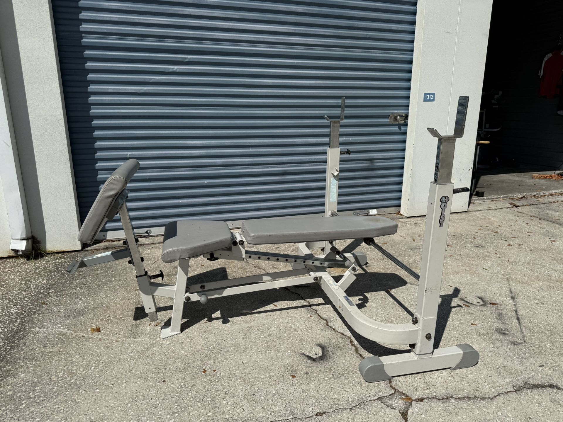 Hoist Olympic weight bench Flat incline decline Adjustable uprights Preacher curl attachment Space saver and folds up Home garage gym