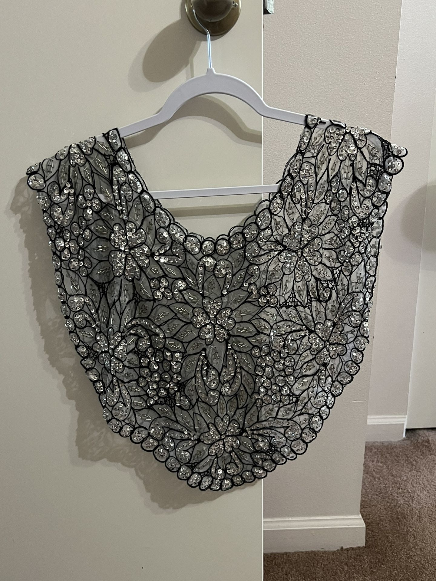 In excellent condition! Beautiful and elegant!! Wore it only one time for a wedding smoke free home. Bought it at a boutique in one of Las Vegas Hotels.