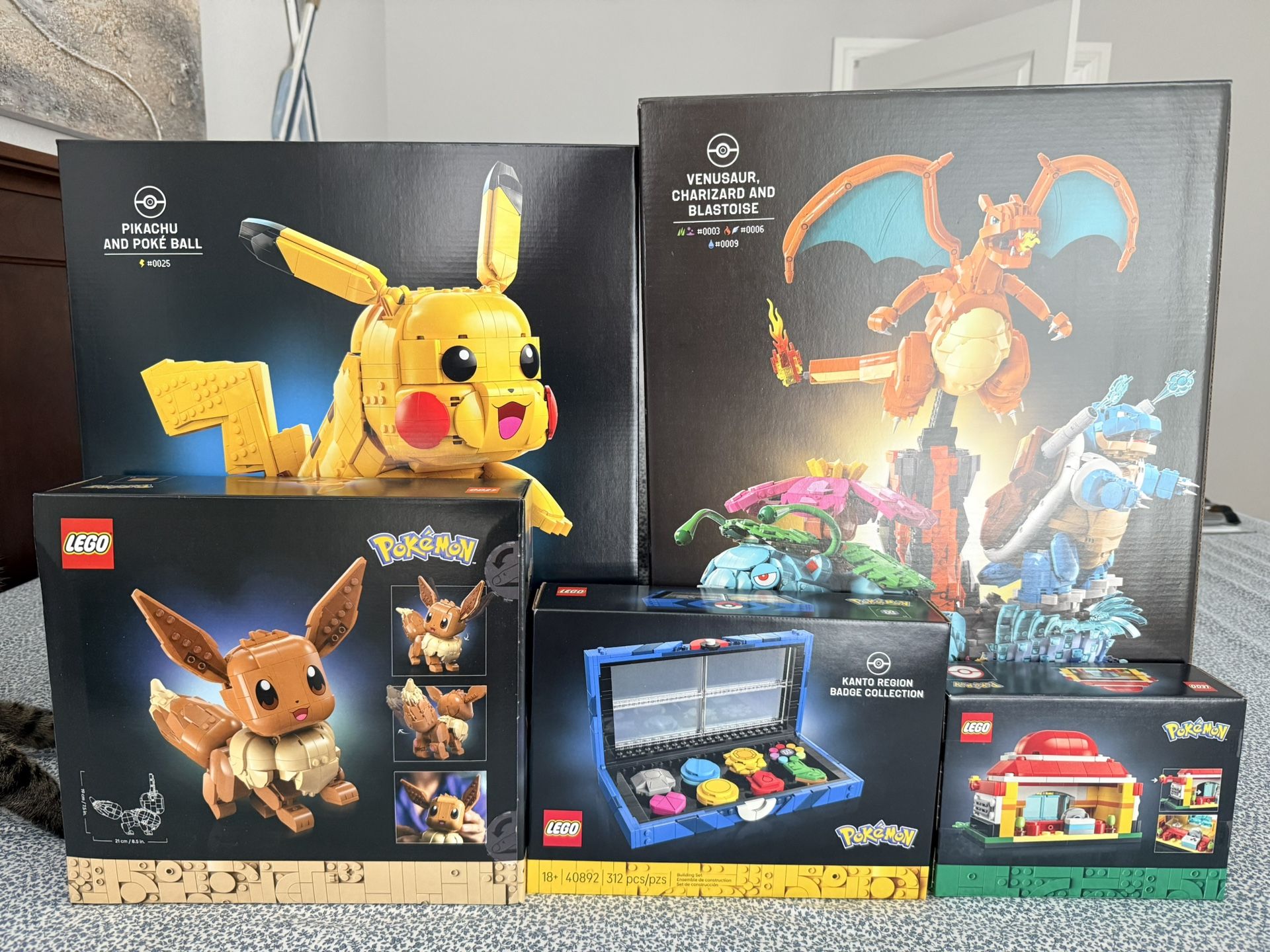 The following bundle is for sell! All sets are brand new and sealed; purchased directly from their website. Cash only. Price is FIRM. Venusaur, Charizard and Blastoise (Set #72153) Pikachu and Poke Ball (Set #72152) Eevee (Set #72151) Kanto Region Badge Collection (Set #40892) Mini Pokémon Center (Set #40911)