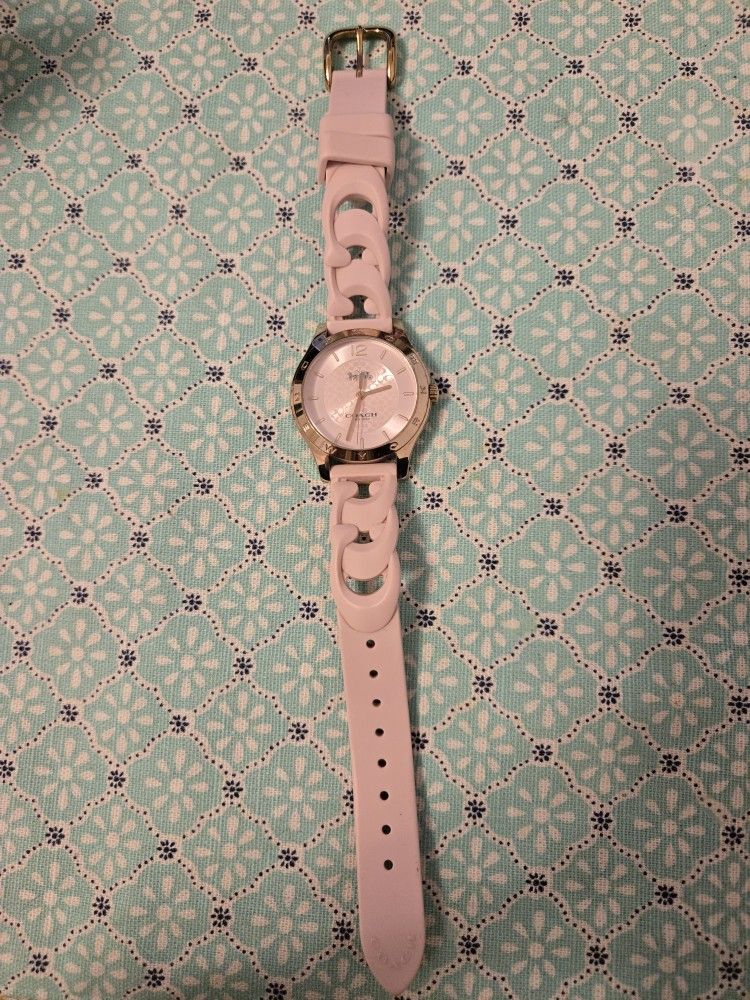 Pink and Gold Coach wristwatch with silicone band water resistant and stainless steel.
