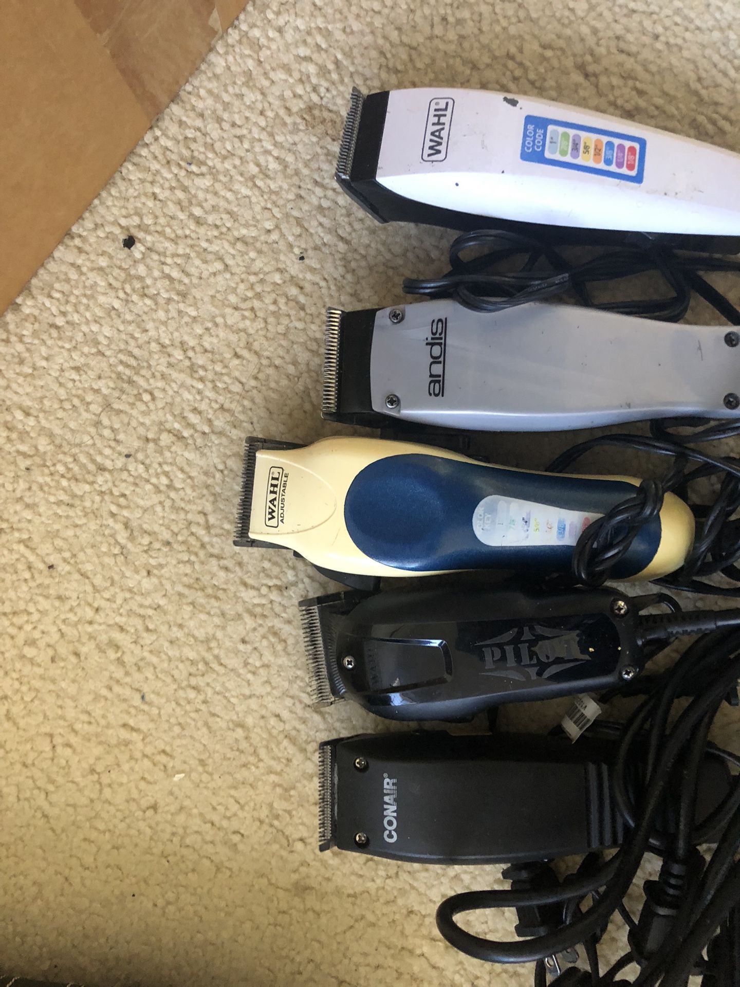 5 total hair clippers and a bag of accessories! All name brand and all in good condition! Great for a barber! All works great! Andy’s wahl conair etc! A bag full of clippers guards and other accessories! Take all for $70 or best offer