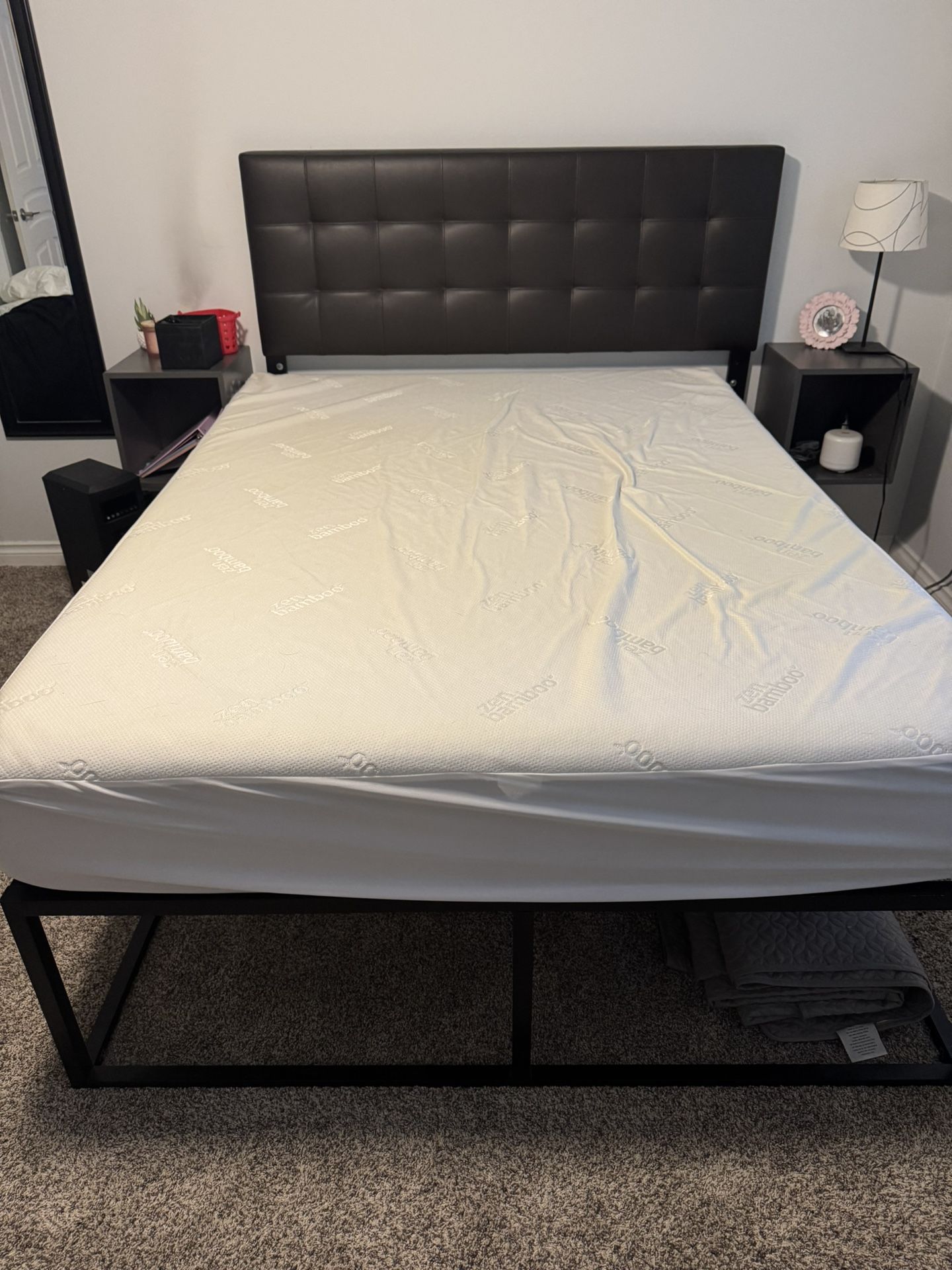 Modern Queen Bed Frame + Upholstered Headboard + Mattress – $200 OBO