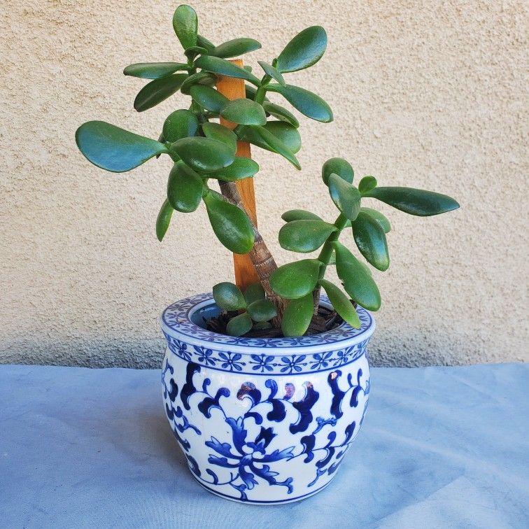 Gorgeous Ceramic Planter With Jade Tree-Money Plant. 6" Designer Ceramic Pot in light/dark blue & white colors. Makes a striking combination. Total heigth is 12"