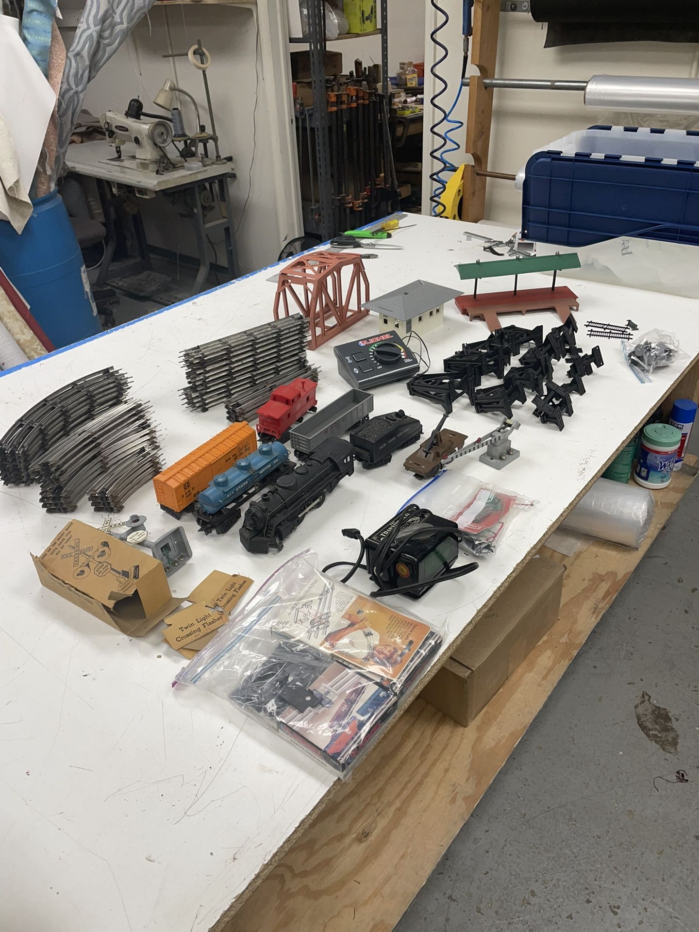 Micalizzi Antiques and Furniture Restoration, Phone: (732-490-5700). Located on 28 Harrison avenue Building #9 Englishtown New Jersey. Hours: Monday - Friday 9-4, Saturday 10-3. Perfect setup vintage Marx train set from the 1950's with tons of accessories. The Locomotive is metal. Nothing has been tested but everything looks to be in great condition. There train model is #666 and has the matching coal car, and other cars to follow. There are plenty of tracks, many straight and many curved. There are two transformers, an original Marx and a Lionel, both should work for the sets. There are the pieces for a trestle, a bridge, a station and a little house. Tons of other small extras included as well. Perfect for a simple layout