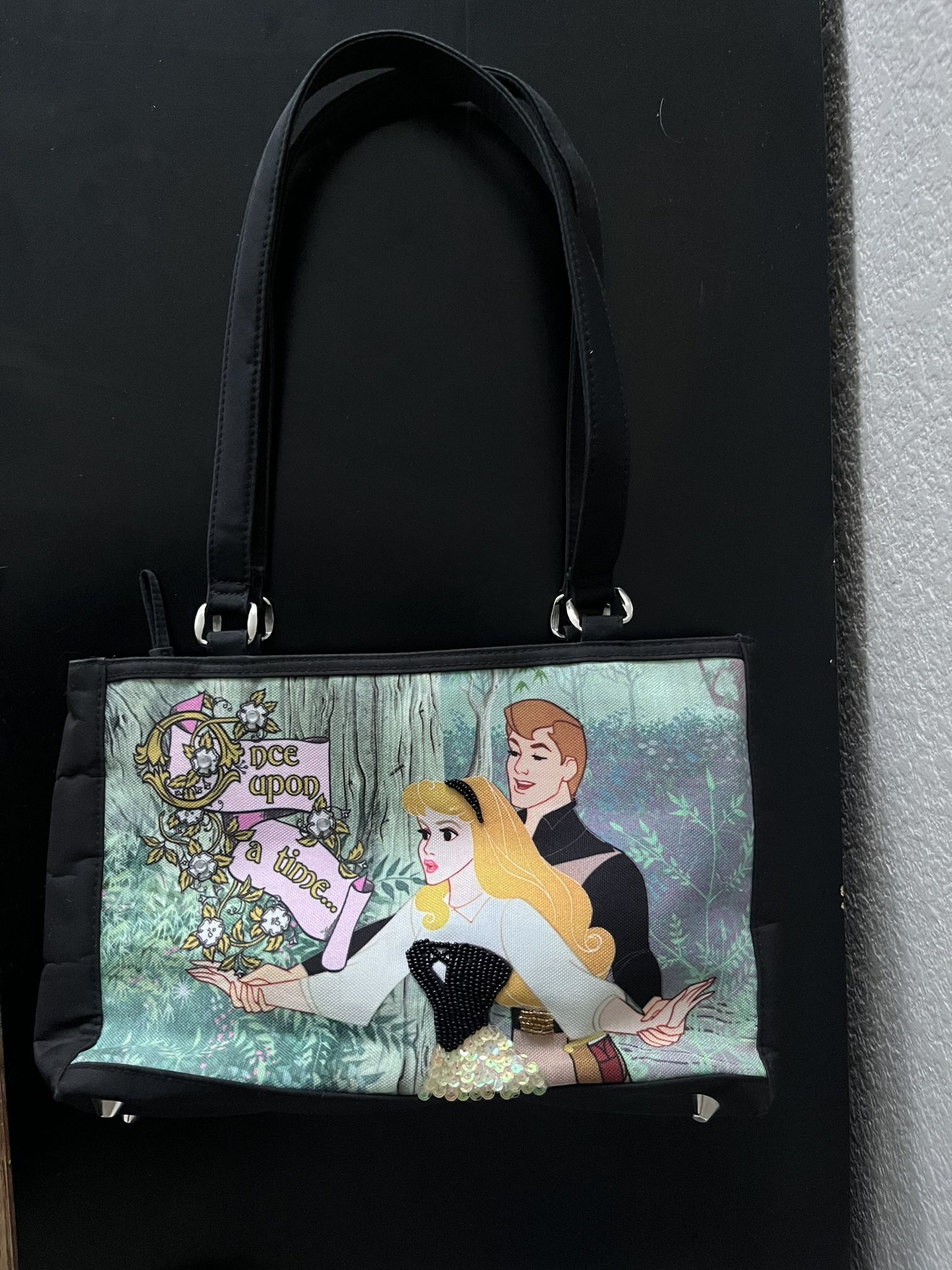 Beautiful Disney Sleeping Beauty canvas bag featuring intricate beaded detailing of Aurora. This bag is in excellent used condition and shows minimal signs of wear. Made of durable canvas with three large pockets and magnetic snap closures for easy access. A perfect collectible or everyday bag for Disney fans