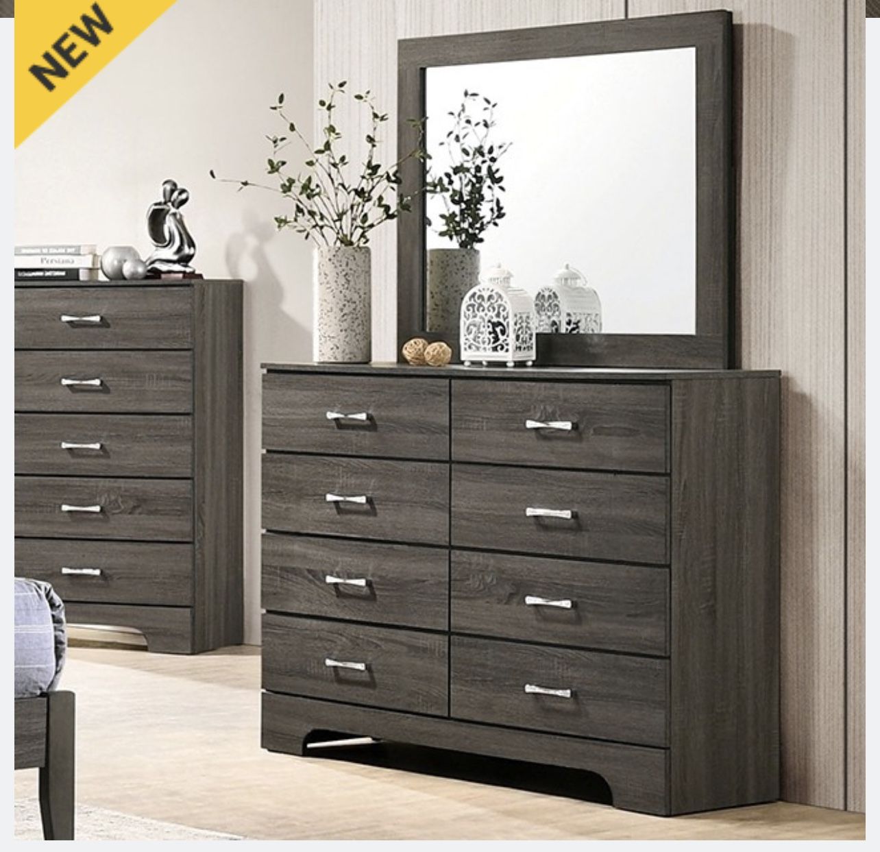 ** new in packaging ** mirror not included Faux diamond handles Grey wooden style 51 1/2"W X 15 5/8"D X 35 5/8"H