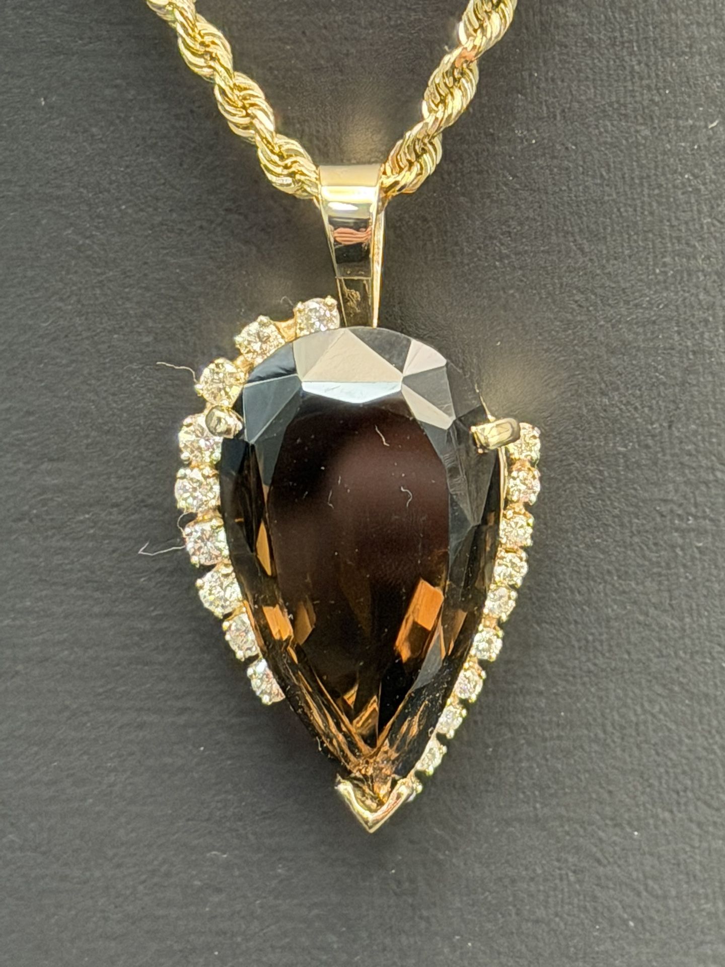 Pendant 14kt yellow gold 12 grams total weight Smokey quarts stone 1 1/8th” long .5” wide 9 -.10 Cttw natural diamonds on one side 10-.5 cttw natural diamonds on other side 1 cttw total Diamond weight Rope chain 13 grams 14kt yellow gold 21” L 4 centimeters width