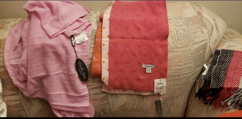 NWT Pink Caroline Grace 💯 cashmere scarf shawl approximately 92”x20”, very long. Asking price is $47. NWT Castlerig💯 cashmere scarf approximately 8”x68”. Polka dot, multicolored (depending on what side to wear). Asking price is $47. Pick up in Deerfield or can ship via OfferUp. Please check my other cashmere scarves.
