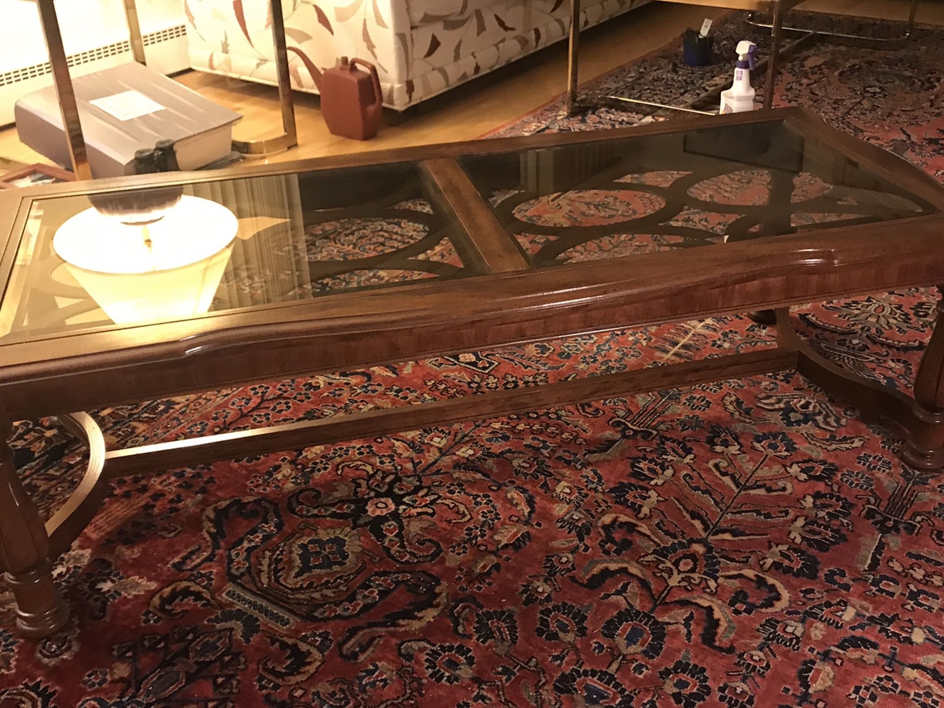 Solid wood coffee table with glass top measures 56 x 24 x 16