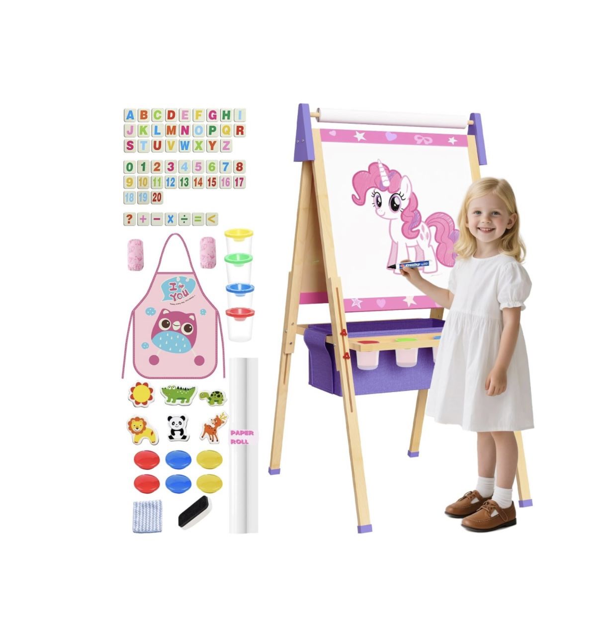 3-In-1 Art Easel】This wooden kids easel is equipped with a double-sided magnetic board and a paper roll. Blackboard can be painted with chalks for exquisite works, while the whiteboard allows children to paint with marker pen and magnetic stickers without dust for healthy use. And the top paper roll gives children more creative space. 【Rich Art Supplies】Except for the kids art easel,we provide enough art supplies you need for your kids, including 1 paper roll, 2 dry eraser, 3 whiteboard markers, 1 box of colorful chalks, 4 paint pots, 1 magnetic ruler,1 apron and sleevelets,2 storage bags,which can fully meet your child's needs of painting, coloring, playing mathematics games and more. 【Adjustable Height Easel】You can adjust the height of kid's art easel from 48 to 57.7inch,adapt for different ages and height of the kids.meaning that your baby only needs one easel from kindergarten to elementary school to accompany their growth.