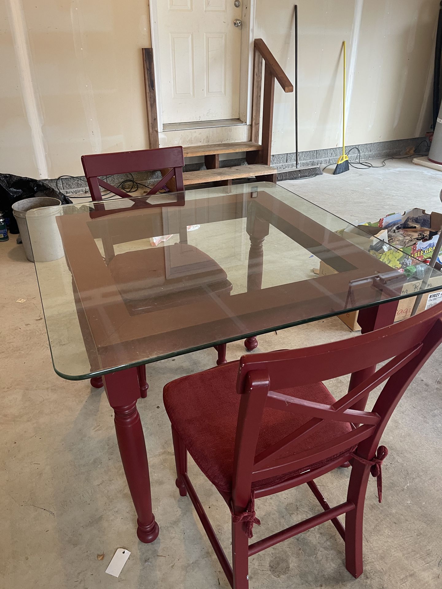 This 40”x40” table has quality construction with dovetailed joints. The glass top is tempered and extremely thick with nice rounded edges for safety. The chairs are from Pier 1. Minimal time invested could easily change the paint color if the color of this item doesn’t fit your decor.