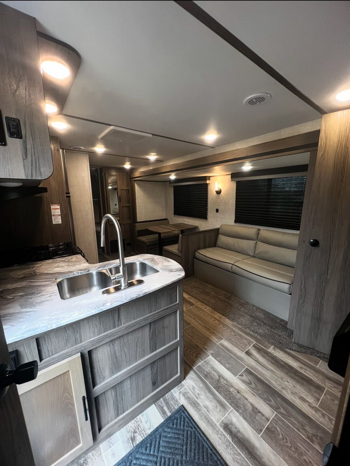 Sleeps 7 - Queen bed in private room - 3 bunks in the back room - Sofa bed 1 Slide out Outdoor kitchen 30 amp power Overall length 32’ 6” Electric awning Electric front jack Wi-Fi and satellite TV ready connections solar panel prep back-up camera hookups multiple USB ports Non-smoker No pets Fully contained in great condition Upgraded refrigerator Clean Title on hand