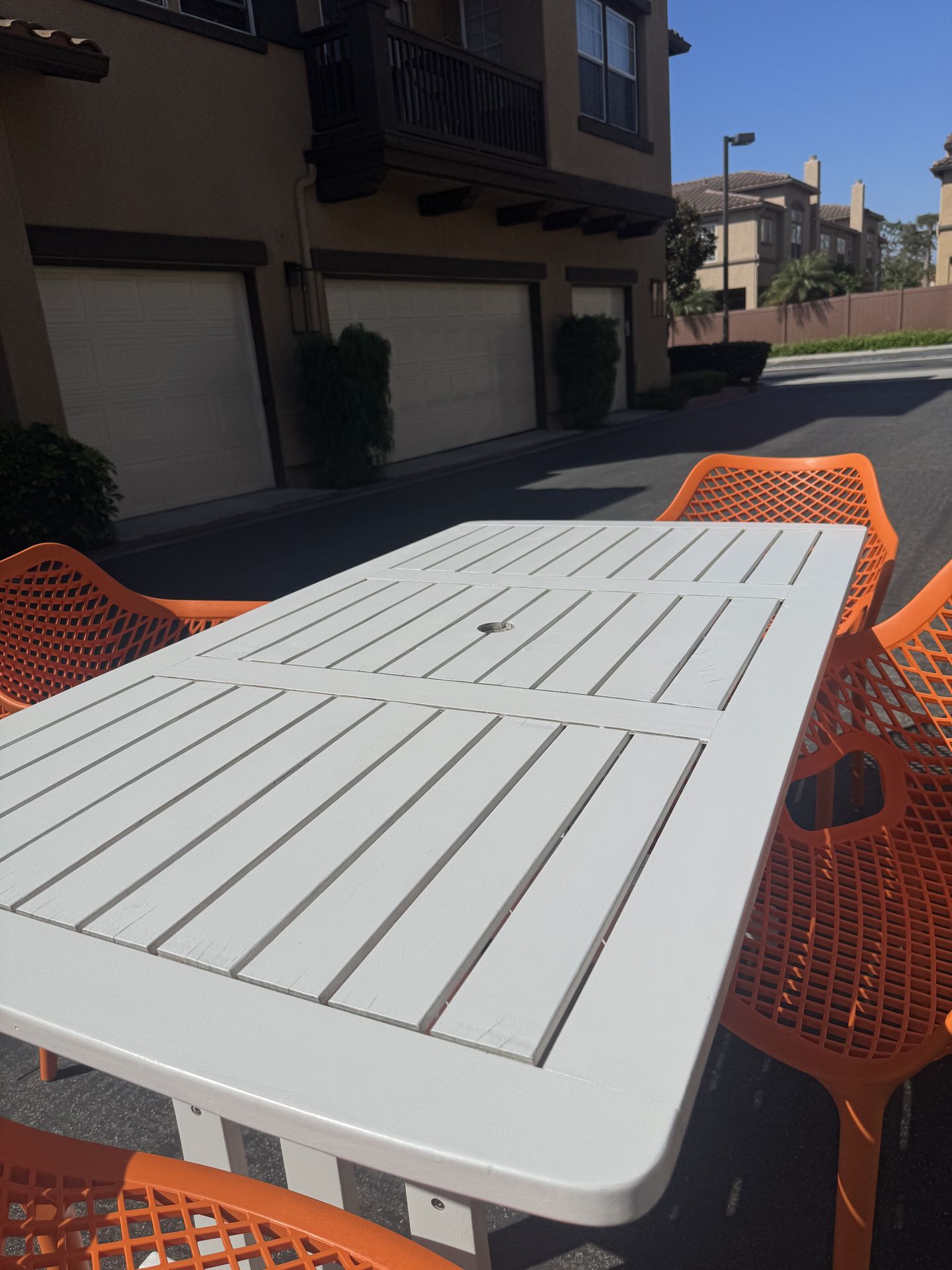 BEAUTIFUL WHITE TABLE ABOUT 30 x 50; 4 PLASTIC HONEY COME ORANGE CHAIRS .