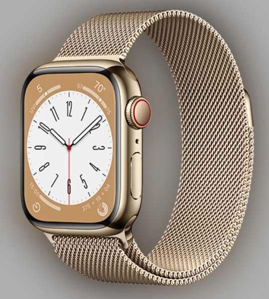 The Apple Watch Series 8 (45mm, GPS + Cellular) features a 396 x 484 pixel Always-On LTPO OLED display (1143 sq mm area) in a 45 x 38 x 10.7 mm case, powered by the S8 SiP dual-core processor. It includes 32GB storage, cellular LTE/UMTS, Bluetooth 5.3, Blood Oxygen/ECG sensors, temperature sensing, 50m water resistance, and ~18-hour battery. Detailed Specifications: Display: 45mm case, Always-On Retina LTPO OLED, up to 1000 nits brightness, 396 x 484 pixels. Dimensions & Weight: 45 x 38 x 10.7 mm; Weight: ~51.5 g (varies by material). Chip: S8 SiP with 64-bit dual-core processor, W3 Apple wireless chip, U1 chip (Ultra Wideband). Connectivity: LTE and UMTS, Wi-Fi 802.11b/g/n 2.4GHz and 5GHz, Bluetooth 5.3, GPS/GNSS, NFC. Sensors & Health: Blood Oxygen sensor, Electrical heart sensor (ECG), Third-gen optical heart sensor, Temperature sensing, Accelerometer (up to 256 g-force with Crash/Fall Detection), Gyroscope, Compass, Altimeter, Ambient light sensor. Battery: Built-in lithium-ion, up to 18 hours, USB-C magnetic fast charging. Durability: 50m water resistant (WR50), IP6X certified dust resistant. Storage: 32GB. Material Options: Aluminum (Ion-X glass) or Stainless Steel (Sapphire crystal). Operating System: watchOS (ships with 9.0, upgradable). RoseGold
