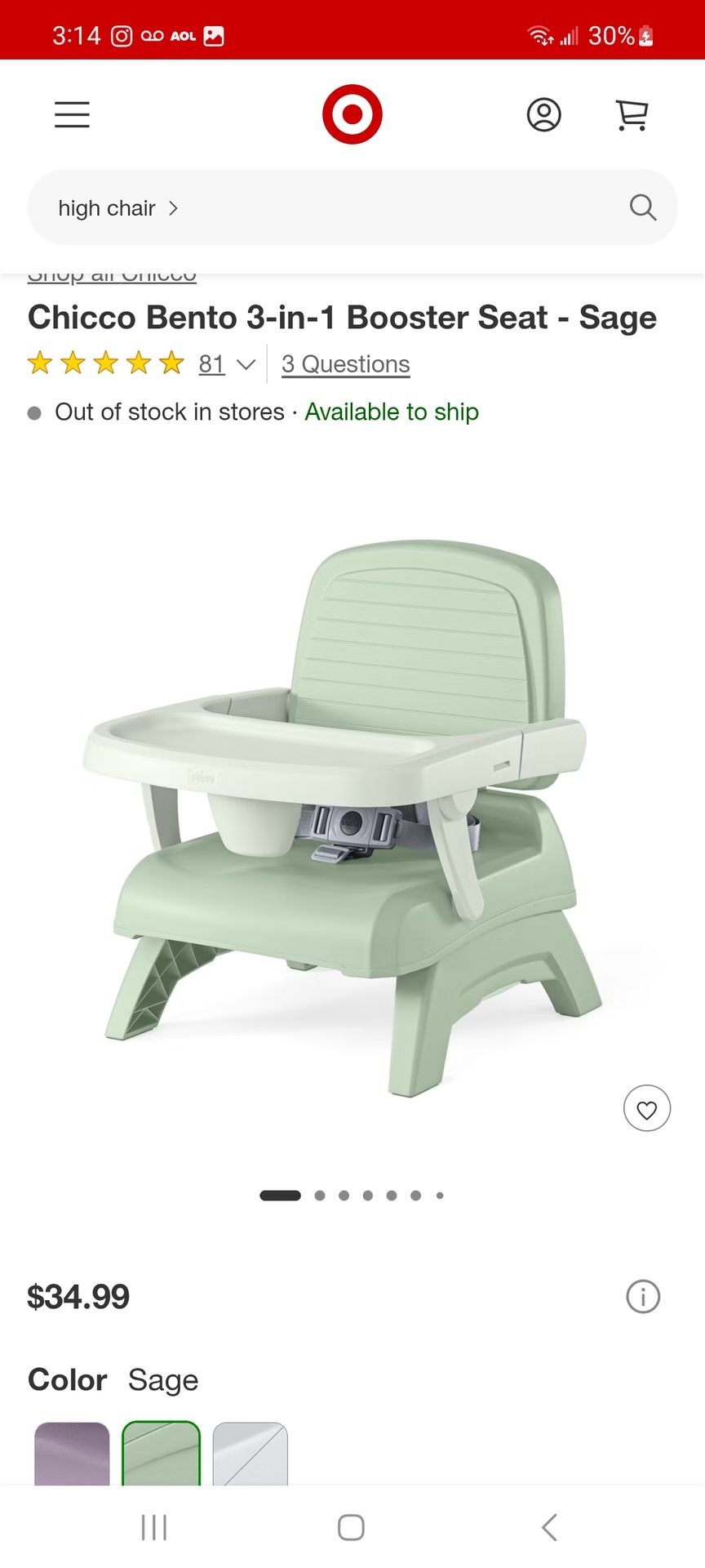 Chicco Bento 3-in-1 Booster Seat - Sage $25