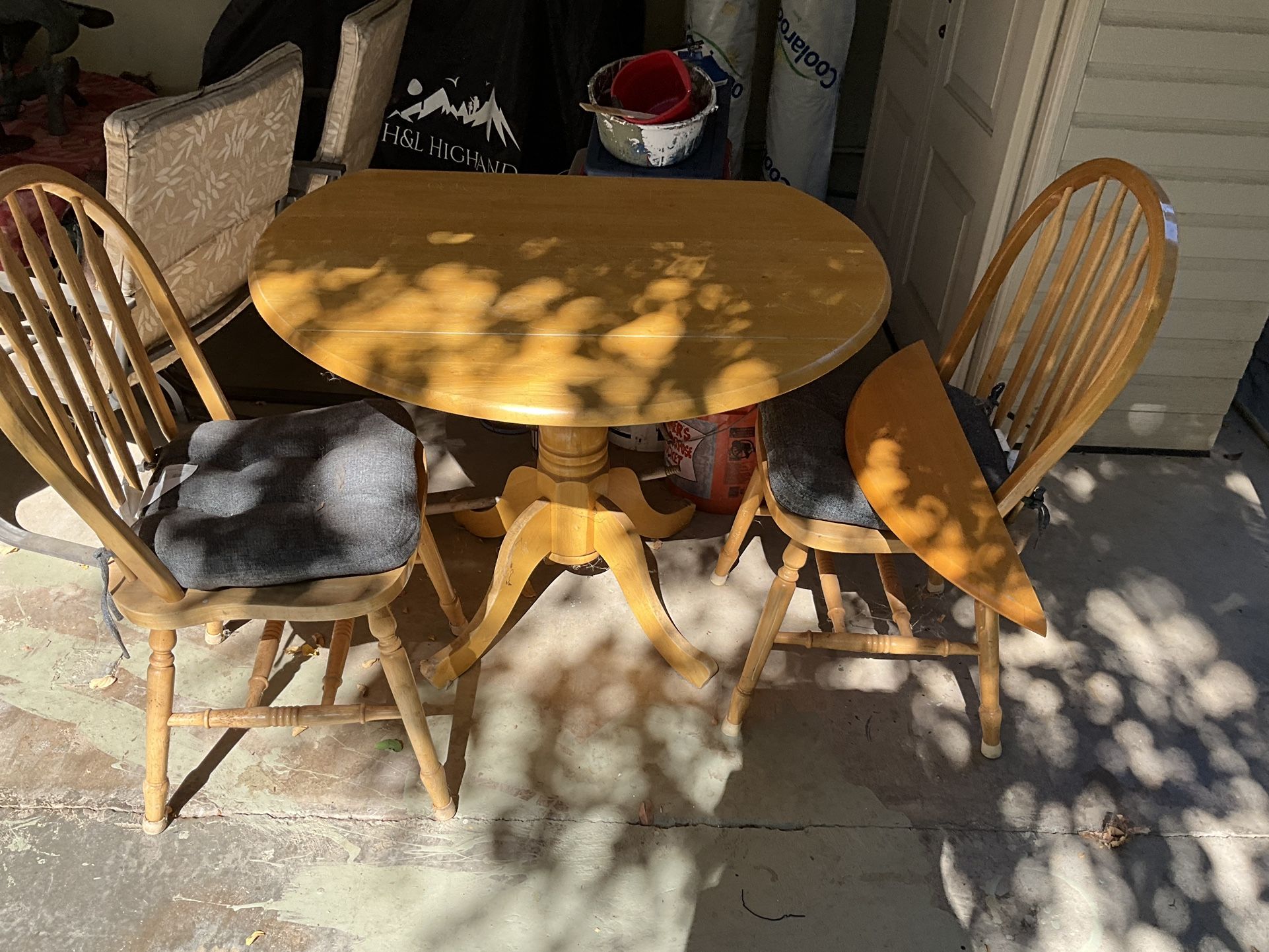 Beautiful, well maintained small blond, solid wood, no veneer, kitchen table with 2 removable leaves and 2 chairs with seat pads. All solid wood
