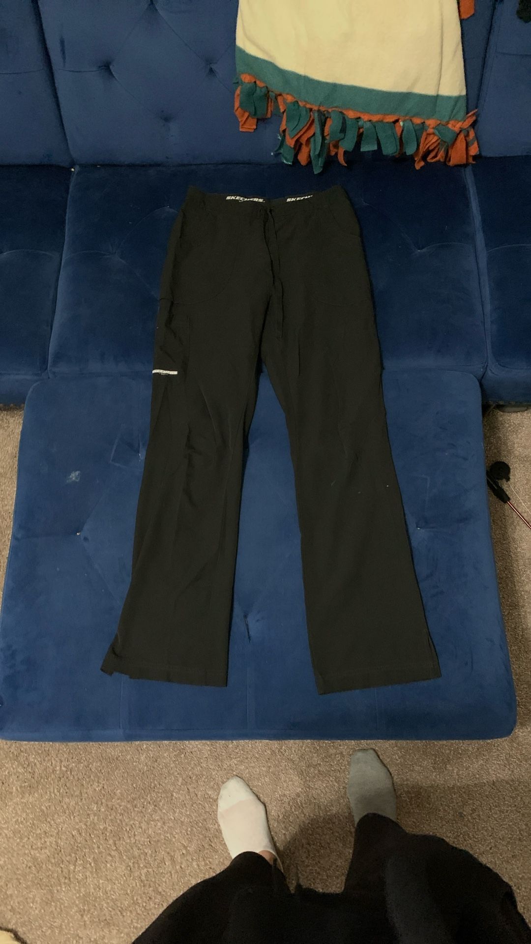 Sketchers black scrub bottoms. Well used and cared for. Working drawstring. Has pockets. Been in storage between moves this creases in fabric.