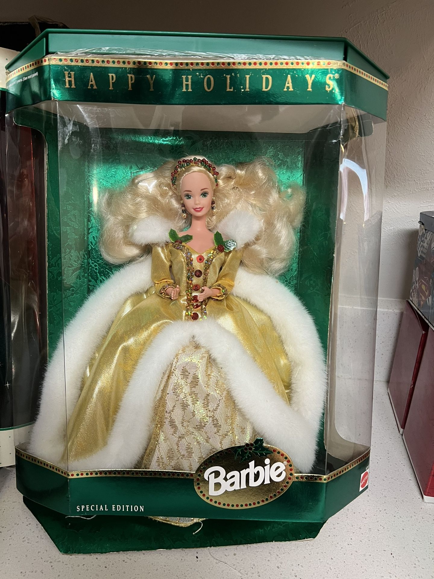 1994 Happy Holidays Special Edition Barbie Doll. The doll wears a golden gown with a white and gold lace underskirt and white faux fur trim. The ensemble is accented with decorative holly and berries. It is a collector's item and includes a doll stand. Box damage $50