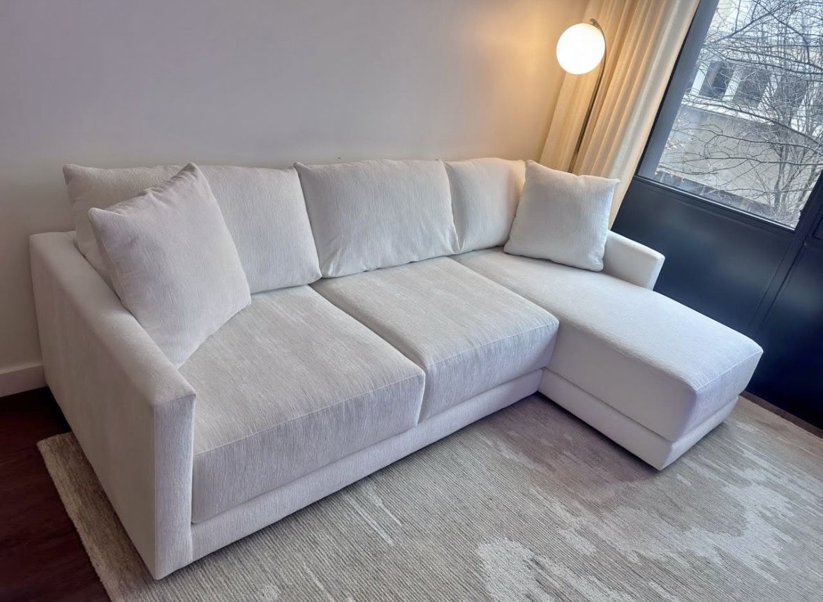 Crate and Barrel Gather Deep 2-Piece Sectional Sofa with Chaise Lounge. Multi-cushion Monet fabric in Frost color.
