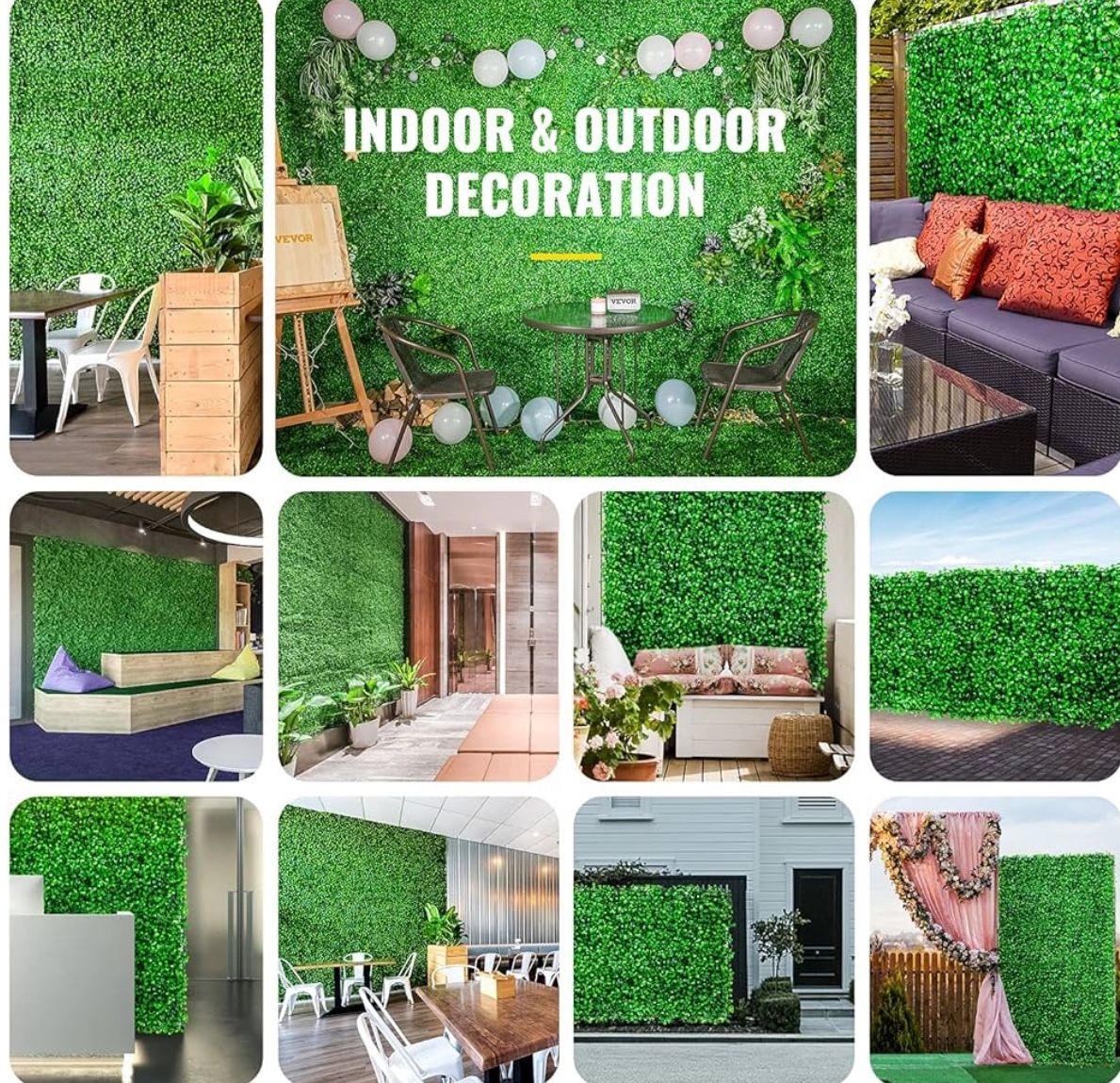 20"D x 20"W x 12"H Durable 100% PE: Size: 20'' x 20"; Quantity: 4pcs; Covering: 33 sq.ft; Thickness: 1.6''. The green wall is made of polyethylene, sun-proof, non-fading, unbreakable, and withstands all weather conditions for years to come. Get ready to make any space stand out and show off your love for nature! Also, our plant walls are odorless, suitable for your home, and friendly to the old and children. It is SGS certificated. High-density Grass Wall: The VEVOR grass wall is upgraded with 8 stems per piece (289 stitches per tile panel) to achieve a "never see-through" effect. It adopts a gradient green color design to provide a more vivid and vibrant view. Besides, Our foliage leaf stems are clear, with no plastic blurs. Create the perfect homemade forest with our artificial grass wall. Hassle-free DIY Installation: Are you frustrated with confusing instruction manuals? Well, there is no need to worry! We provide a step-by-step instruction manual for fast and easy installation. No other tools are required because we prepare 100 zip ties to help you connect and fix the grass wall panels. Then, thanks to their bendability and cutability, you can shape them and place them on curved surfaces just the way you want. Enjoy Your Privacy: Struggling with the fact that people passing by outside can casually see the private activities of your family in the courtyard? Our dense grass wall backdrops are perfect for protecting your privacy on the perimeter of your patio fence while enhancing the aesthetics of your exterior walls. Green Indoor & Outdoor: Get ready to create the perfect space. We have provided extra artificial flowers for breathtaking beauty. The boxwood hedge wall panel is essential for creating a unique environment. Whether you are at birthday parties, weddings, banquets, offices, bars, or home, your new backdrop will make a great addition. It is also the perfect choice for photo walls or greenery backgrounds.