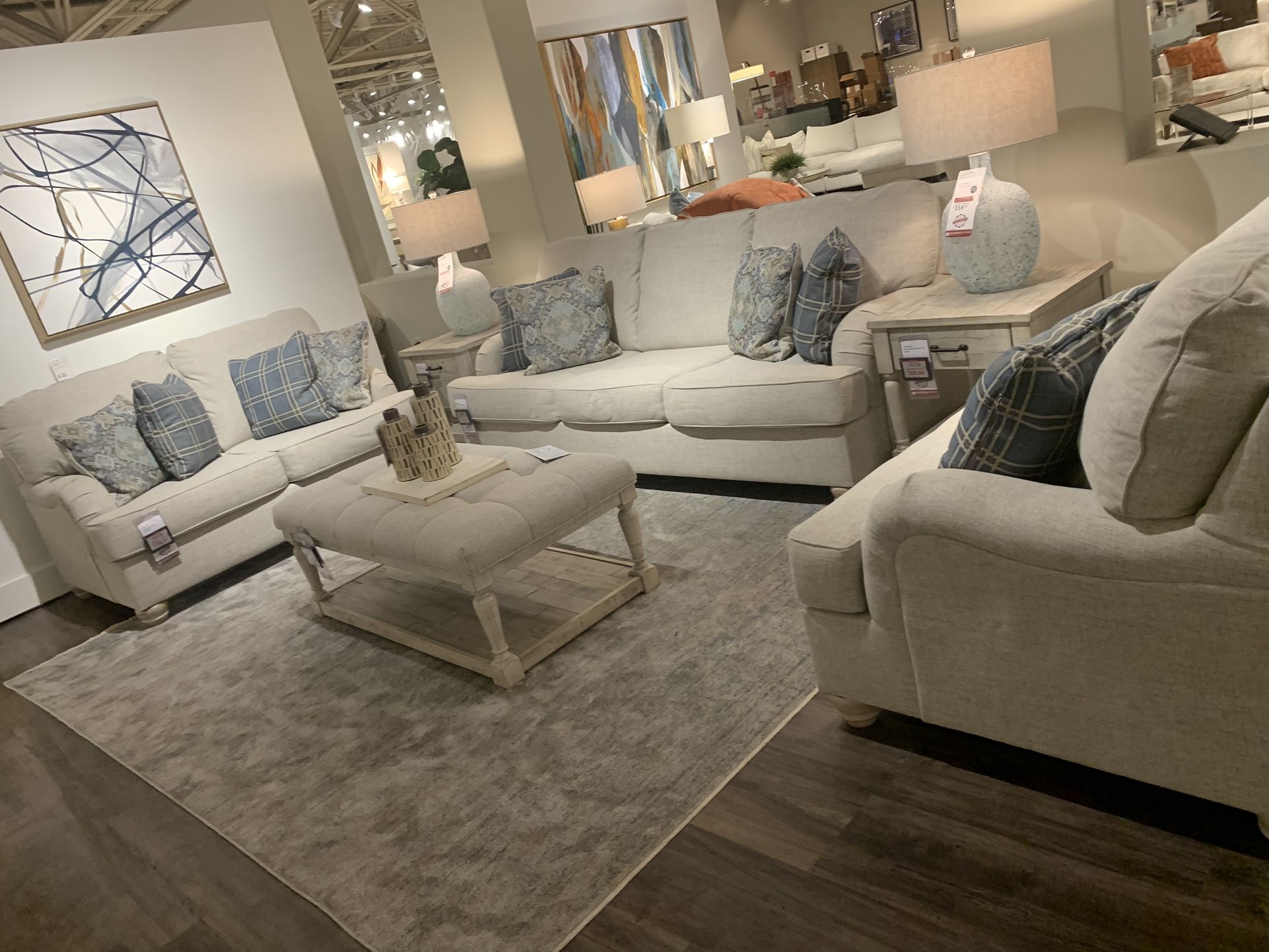 Ashley signature living room set a farmhouse design comes with all accent pillows, antique white fabric and legs.  In stock now ready for pick up or delivery promotional 12 month zero interest message me if any questions. Thank you.