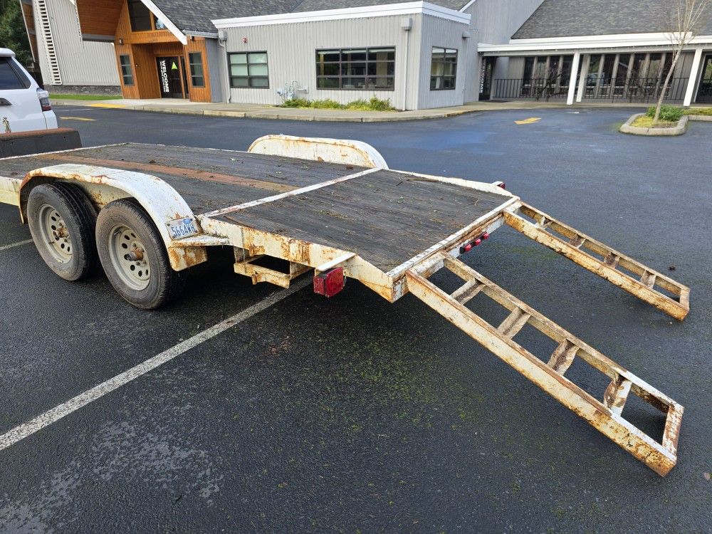 Hello! Yes! Our trailer is available! If you are looking to haul or move any equipment, vehicles, and stuff in general, this trailer is a great investment! It is serviced and ready to work! Specs: Flatbed Trailer GVWR 7000 lbs Length 16 FT Width 7 FT Metal frame solid construction Wood bed Dual axles Great tires Dual ramps with storage compartments Brakes Lights 7 pin round plug 2 5/6" coupler Clean and clear title ready to go. Cash only. Please have your funds and suv or truck available prior to our appointment. We can meet in Tacoma by our storage. Thank you for your interest!