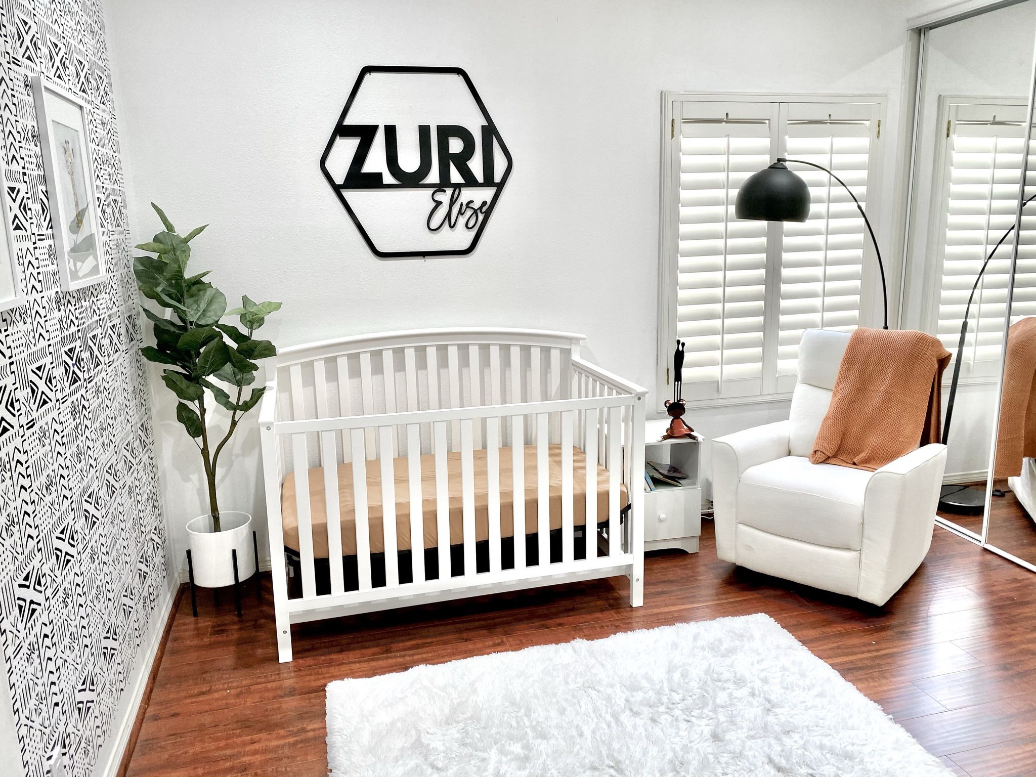 White crib. Crib sized mattress included along with quilted mattress cover and several fitted crib sheets. Converts to 3 different heights for baby crib and transforms to toddler bed