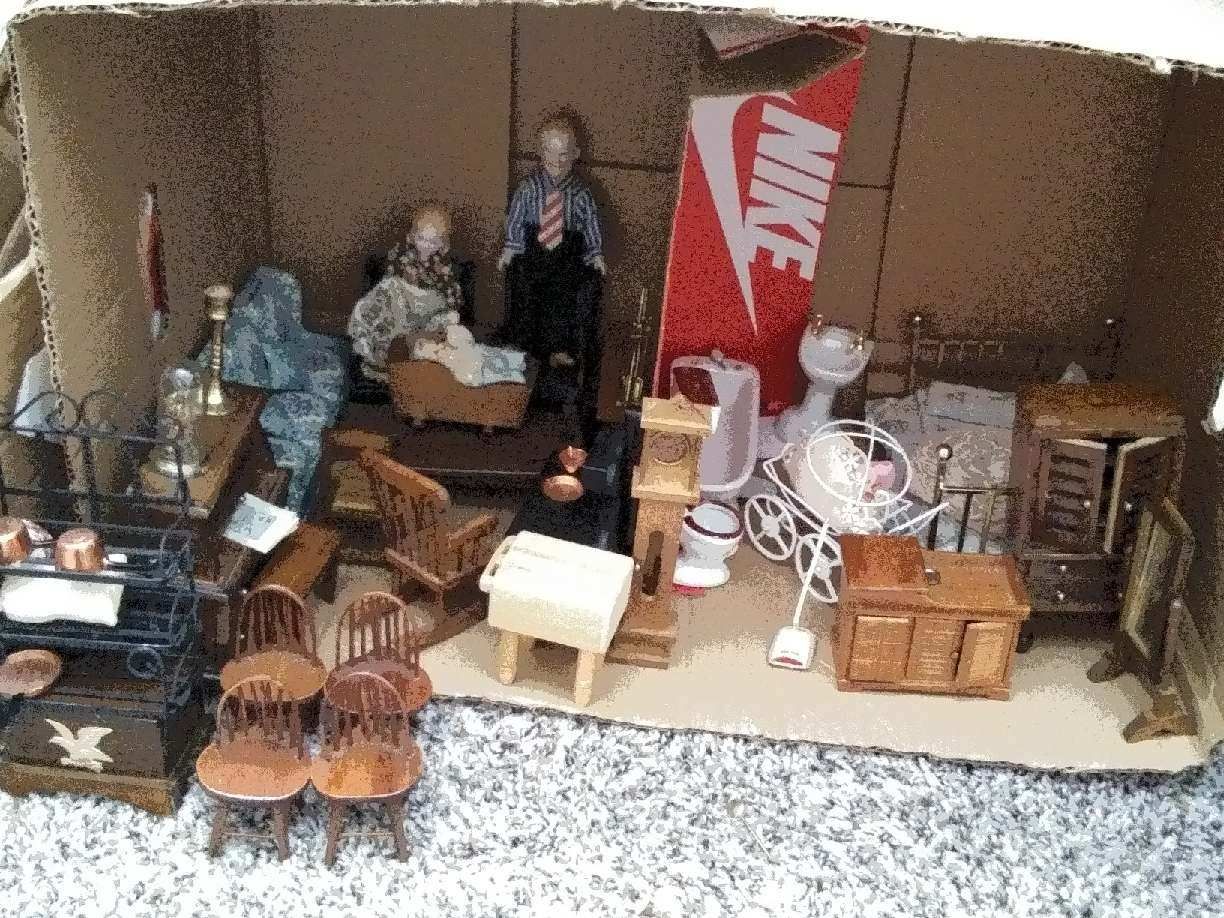 B. Shackman & Co. Full dollhouse set with everything, full porclean bathroom, full living room set, full bedroom set, etc. Full set of everything. In perfect condition. Hasnt even been sitting out. It has been wrapped and boxed and put up and kept safe. I Didnt know what else to set it up in.lol