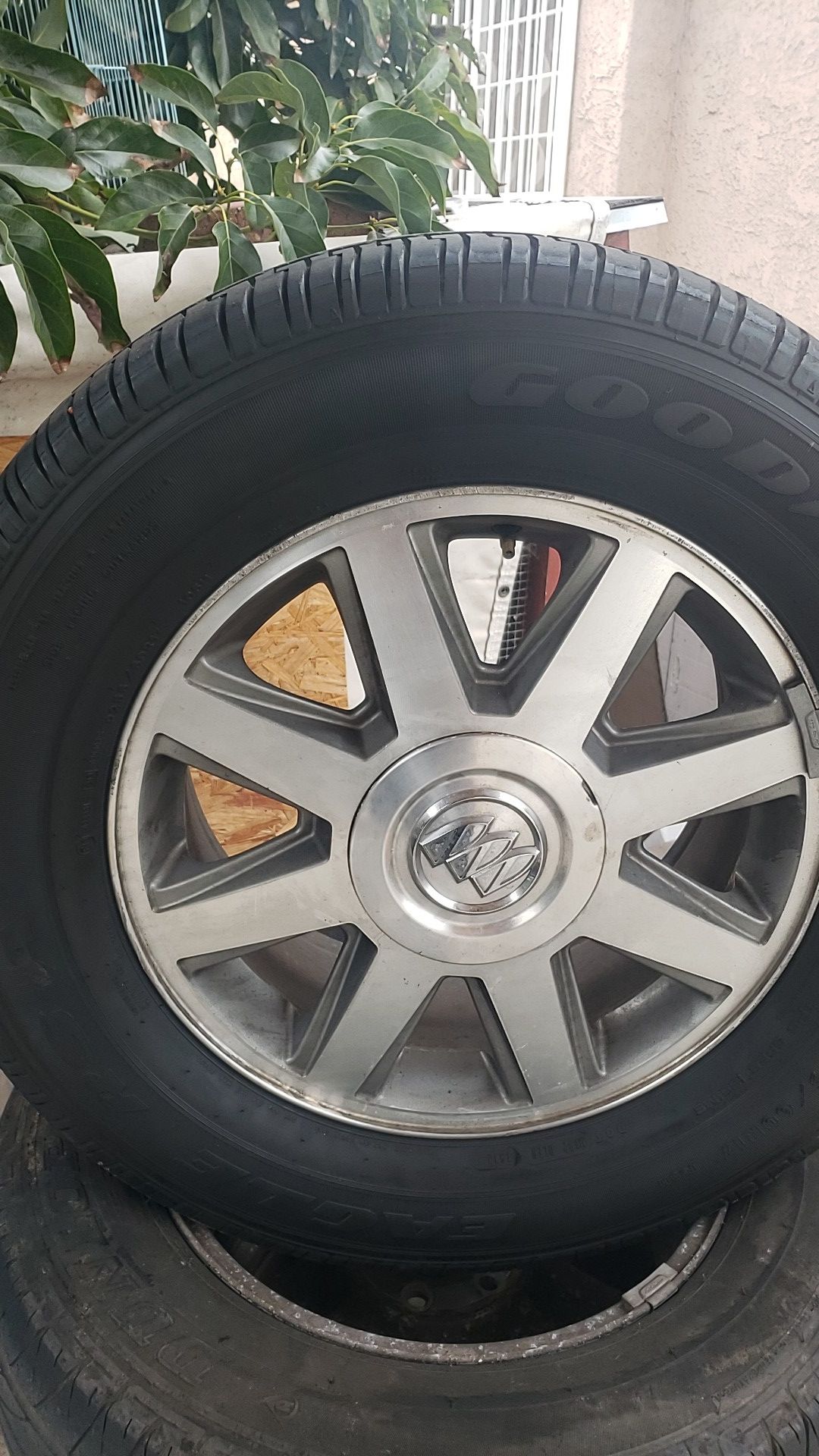Buick model rainier rims 6 lugs with all four center caps. All four wheels and tires , give me an offer Rines buick modelo rainier 6 virlos (hollos) con las cuastro tapaderas Rines y llantas pido offerta?