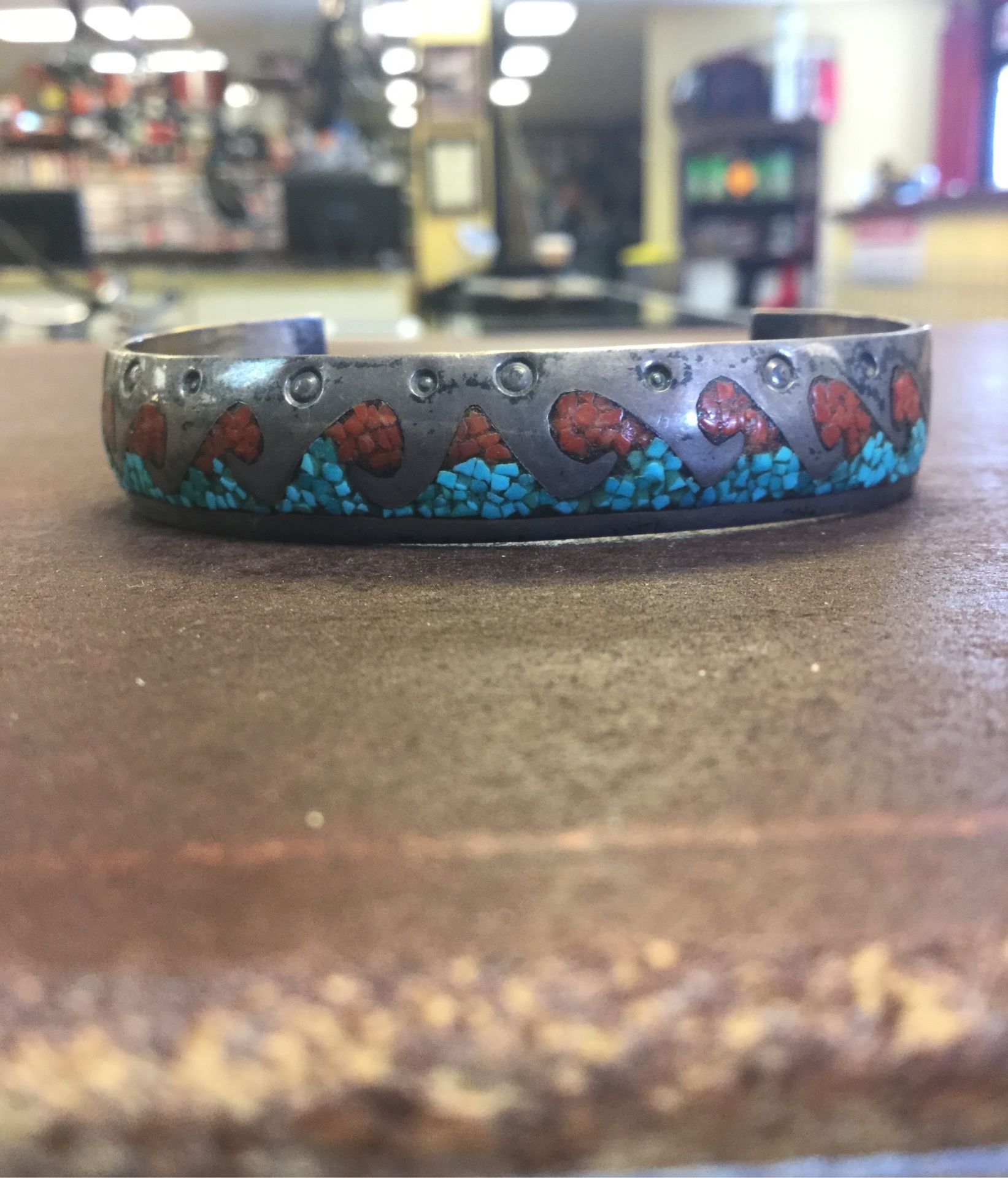 Beautiful coral and turquoise on .925 silver bangle bracelet