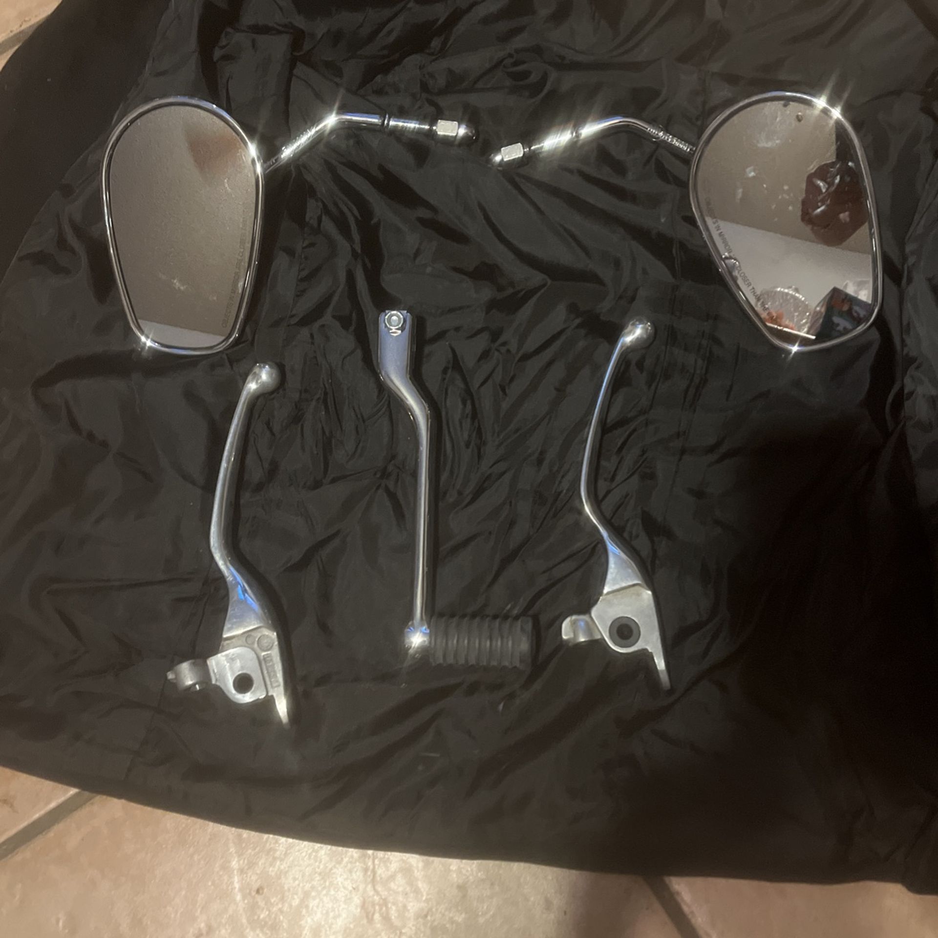 Heritage Harley parts, saddlebags, chaps, raincoat, windshield, mirrors, and levers and shifter