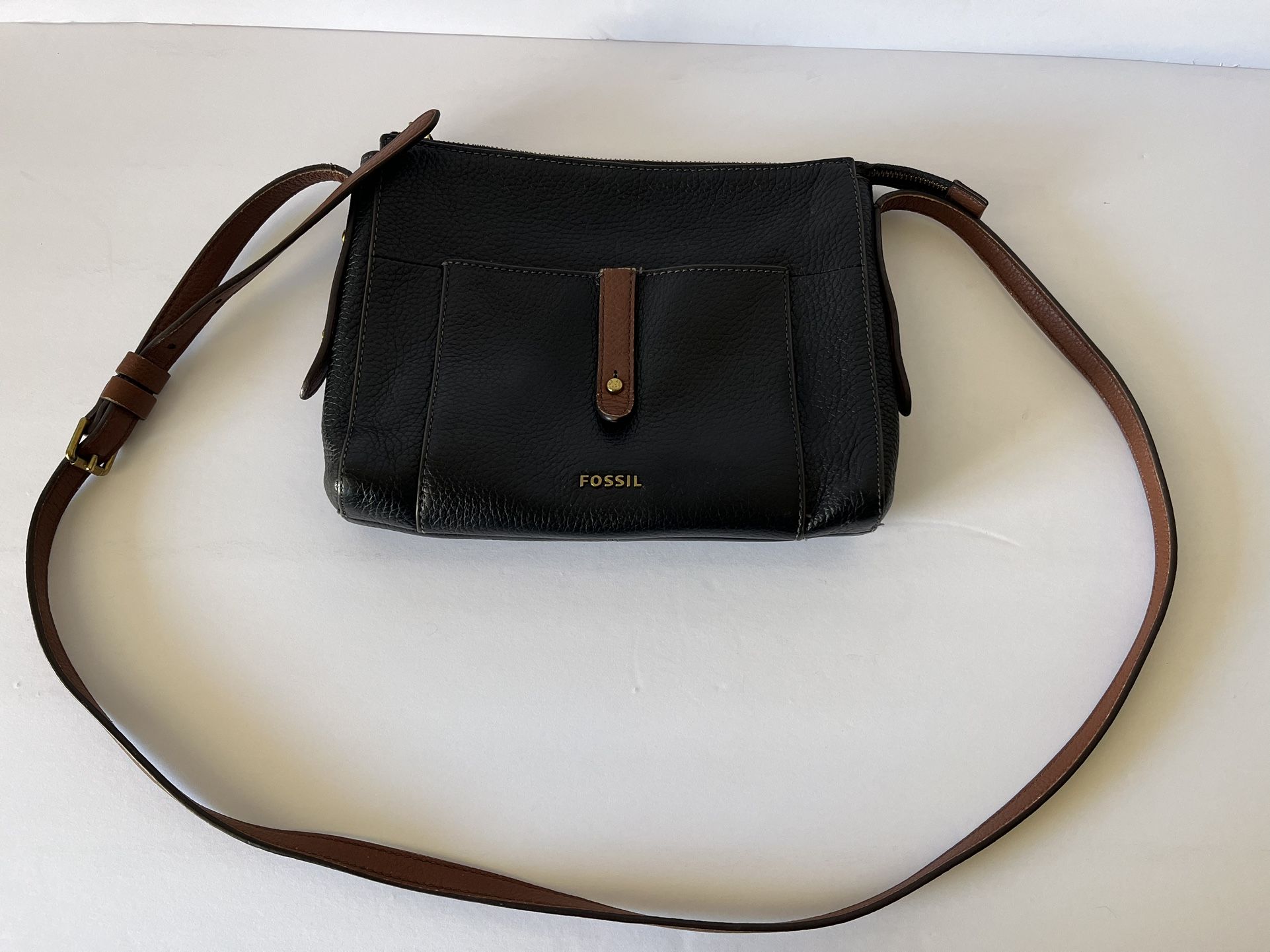 Great used condition No scratches or flaws….see last pic for some rubbing marks on the portion of the strap that is right next to the extension of the zipper. It’s underneath and can’t see it well, but definitely wanted to point it out. Also on the front pocket, where the brown starts, there is some rubbing/discoloration at the top of brown. See pics. Inside clean 😊 Size is approx: 10.5x8x2 Black pebble with brown accents Adjustable strap Fossil Zip closure 7th St and Thunderbird Willing to ship