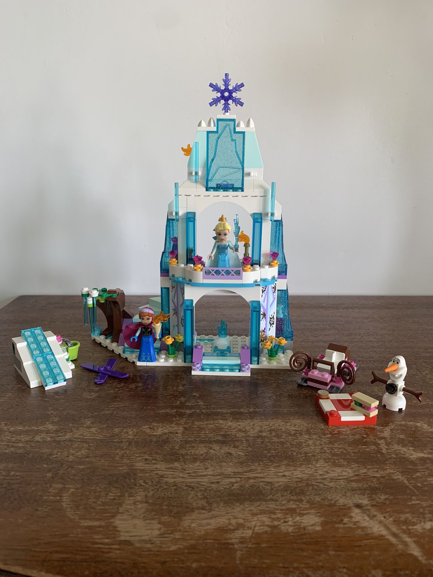 LEGO Disney Princess: Elsa’s Sparkling Ice Castle (#41062). Released in 2015. Complete set with one piece broken (White Brick, Modified 1x2 with Split U Clip Thick). Includes instructions. Gently used and in good condition. Smoke free home.