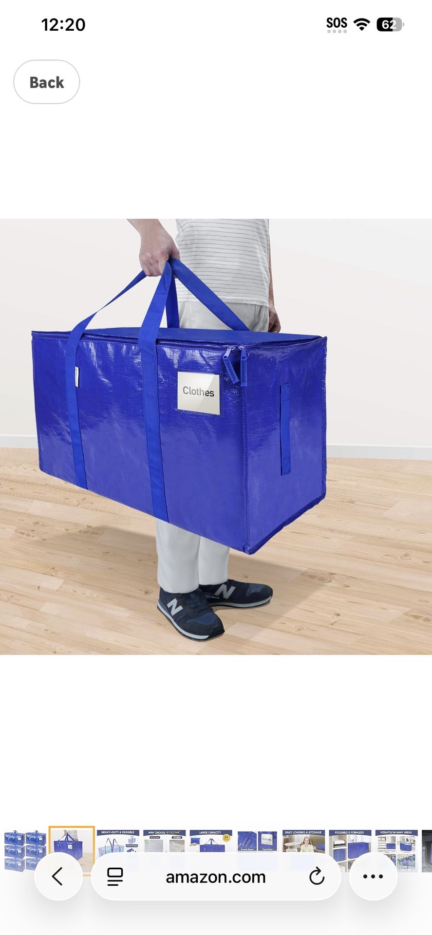 040250 10 in stock 27"L x 14"W x 15"H ✔️ Great alternative for moving box and organizer, holiday storage bag. Waterproof, ideal for space saving, moving, camping ✔️ Heavy-Duty: Made with premium PE material with wide and thick carrying handles surround the luggage/bag, giving the moving bags much more strength to hold heavier loading than stitched handles ✔️ Open Top: The top side of the storage bag can be fully opened and it is much easier to organize, load and unload clothes, books, or anything that you want to put in ✔️ Easy Storage: Foldable materials, just fold and put them away into shelves, or anywhere, they will take no much space to store when not in use ✔️ Tag Pocket: A tag pocket is on the top-right corner with which you can mark your luggage for easier recognizing