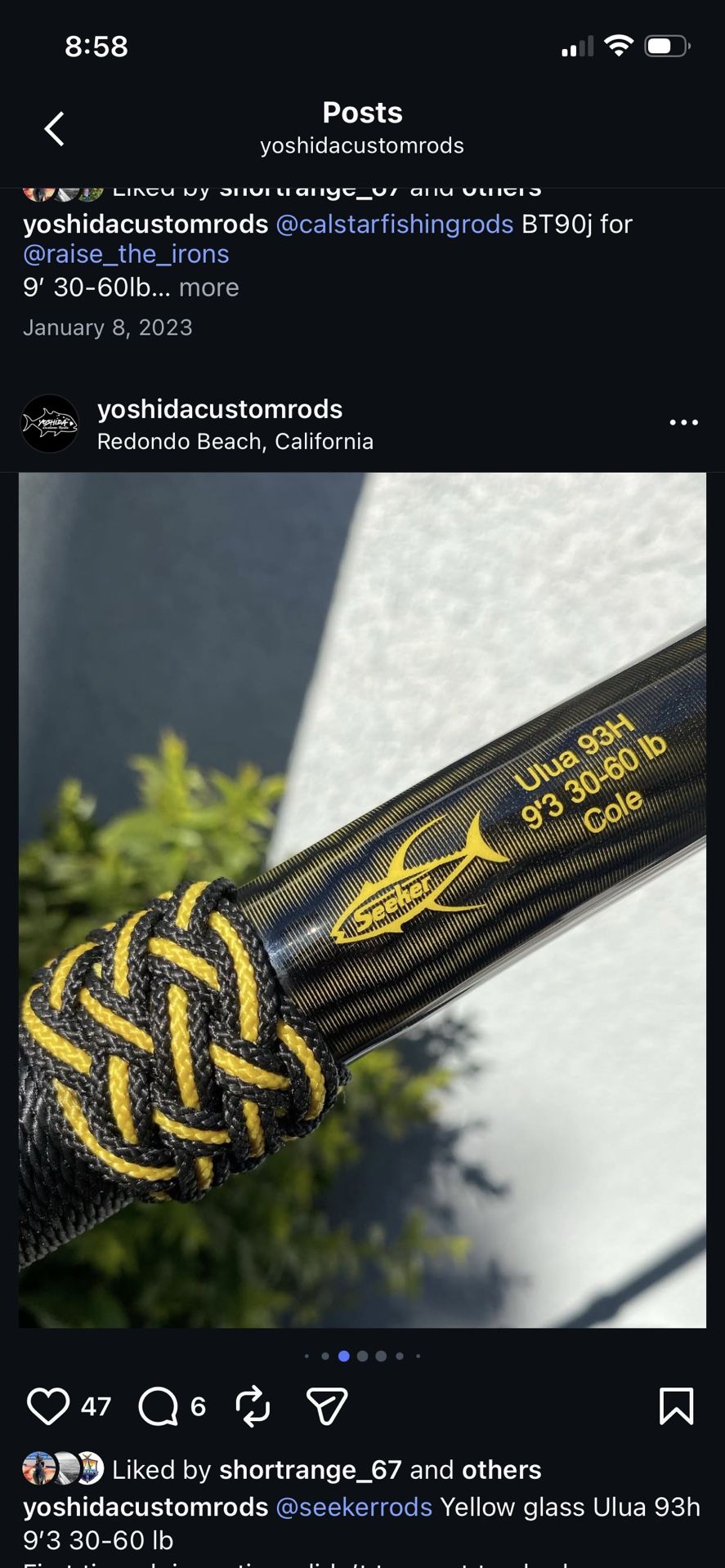 Seeker ulua 93h black and yellow all glass. Got it from Cole Yoshida the wrapper last year, rod he wrapped for himself. Great for yellowtail you don’t want to rock you and big blue fin.