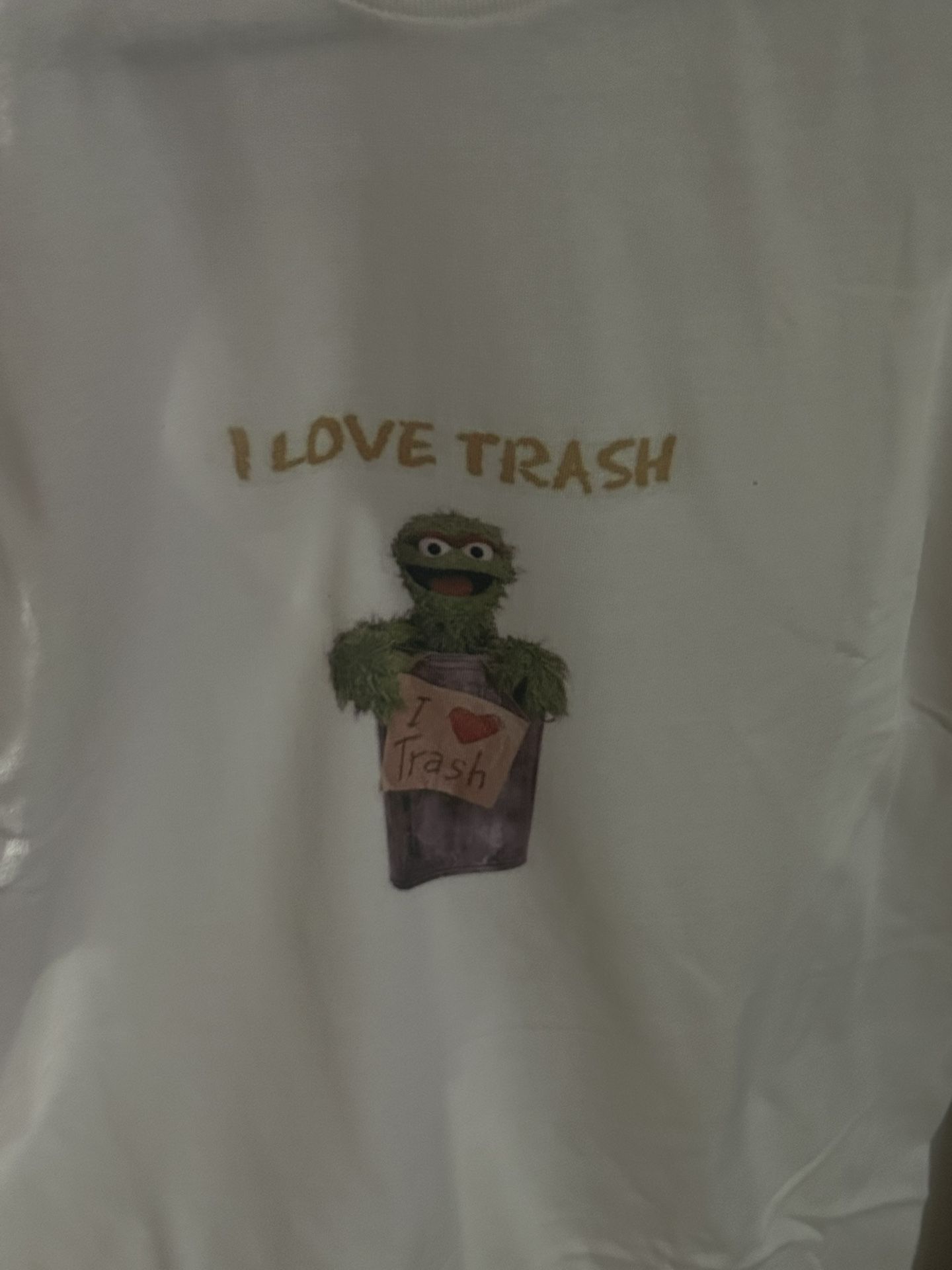 I have Oscar the Grouch brand new T-shirt for sale that says I love trash I make them so whatever size you need just let me know and I will be happy to make it for you or if you would like another image on a T-shirt I will be happy to do it for you. Just message me the image and I can see what I can do. Shipping will be exact.