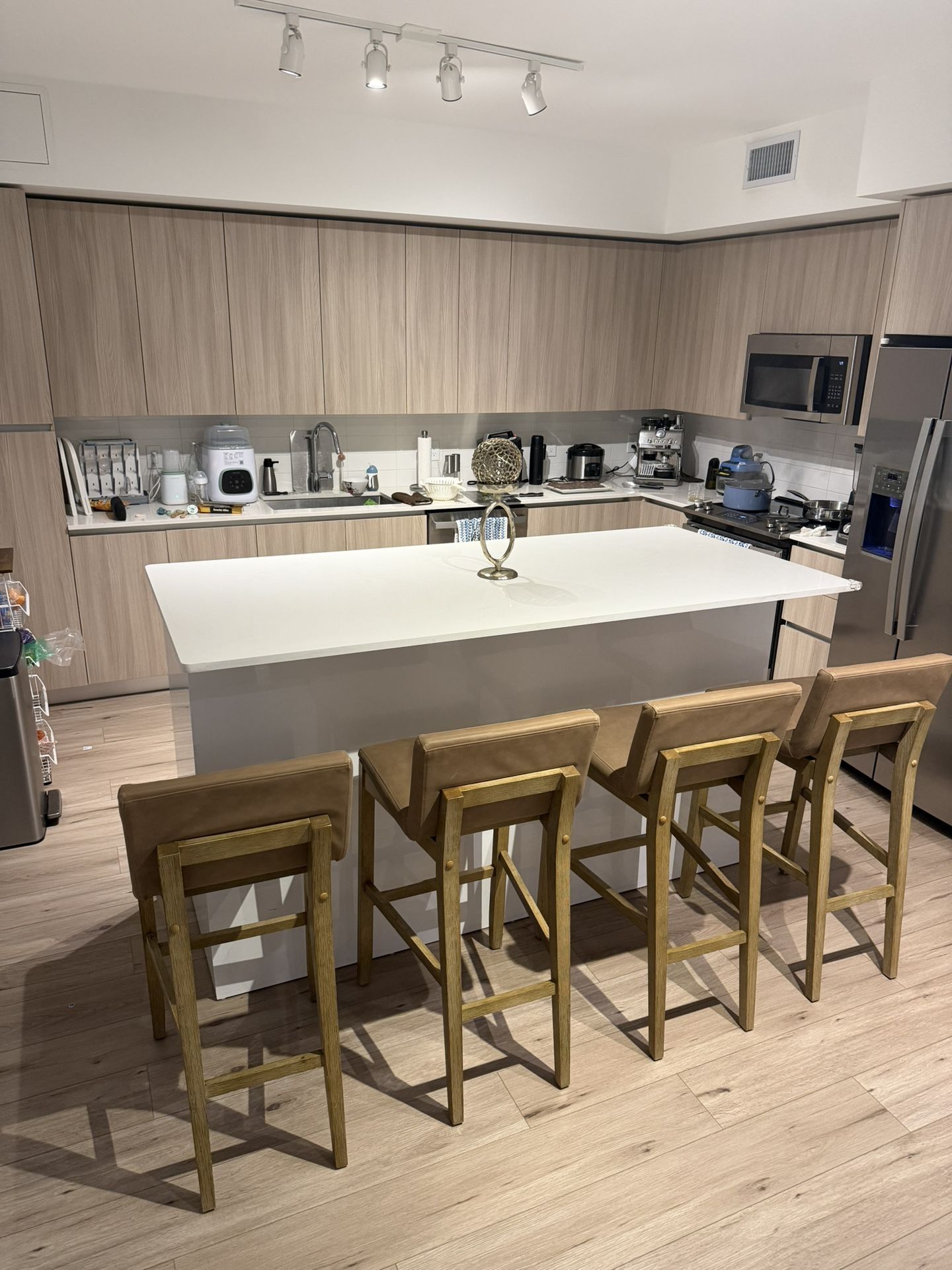 Isla con banquetas. Top de cuarzo, gavetas, estantes para almacenar. Muy amplia, como nueva. Medidas L: 75 in, W: 36 in H: 43 in