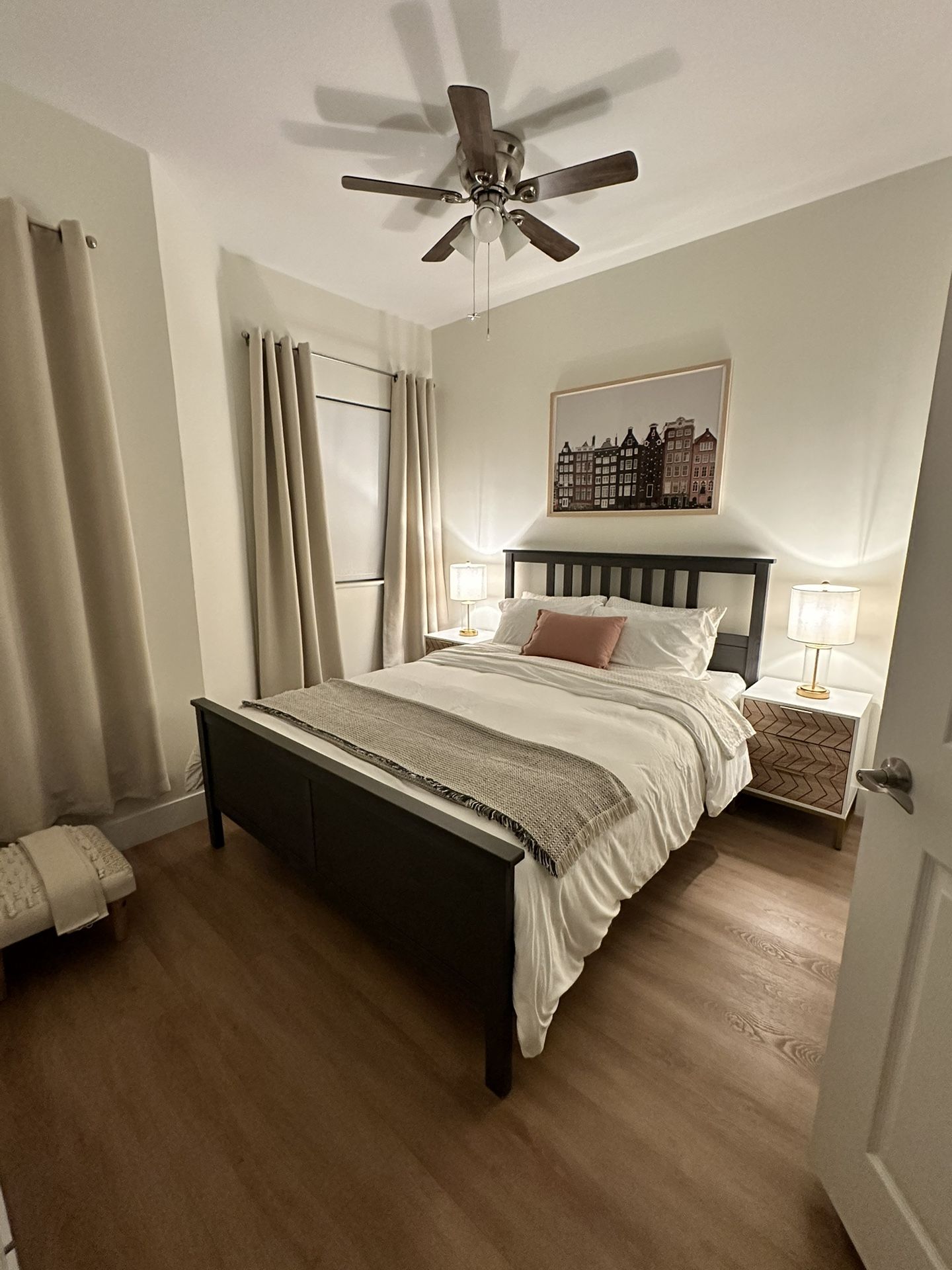 Bed frame only. Dark gray color. Dismantled and ready for pickup. Comes from a pet-free, smoke-free home. Pickup only. Cash only. Assembly instruction manual included.