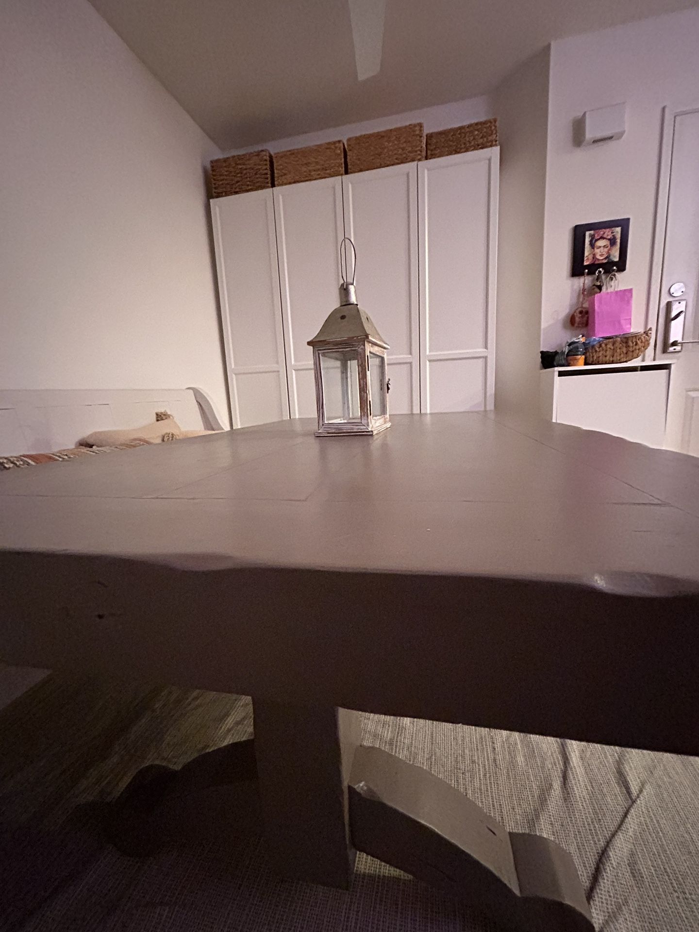 Real wood and in very good condition. Comes with one bench. Style it with other benches or chairs. It can also be your little project if you want to paint it to a different color, this gorgeous dining table has a lot of character and won’t dissapoint.